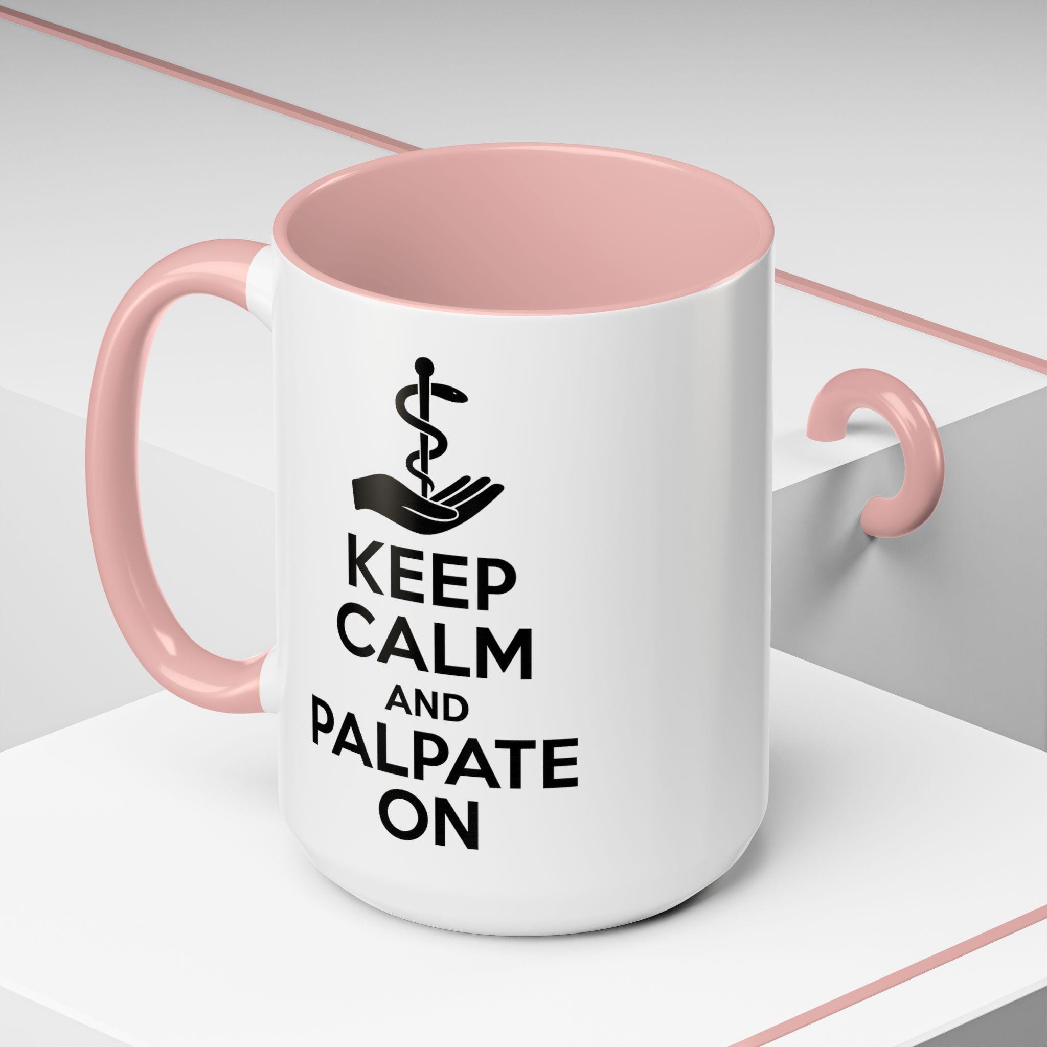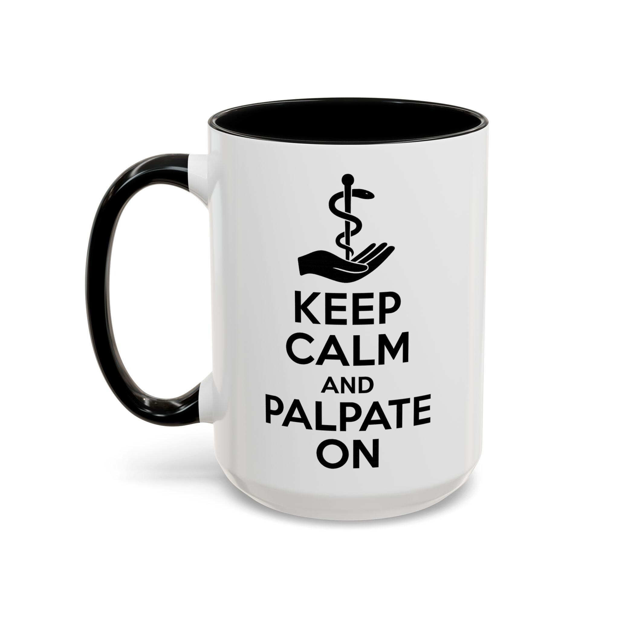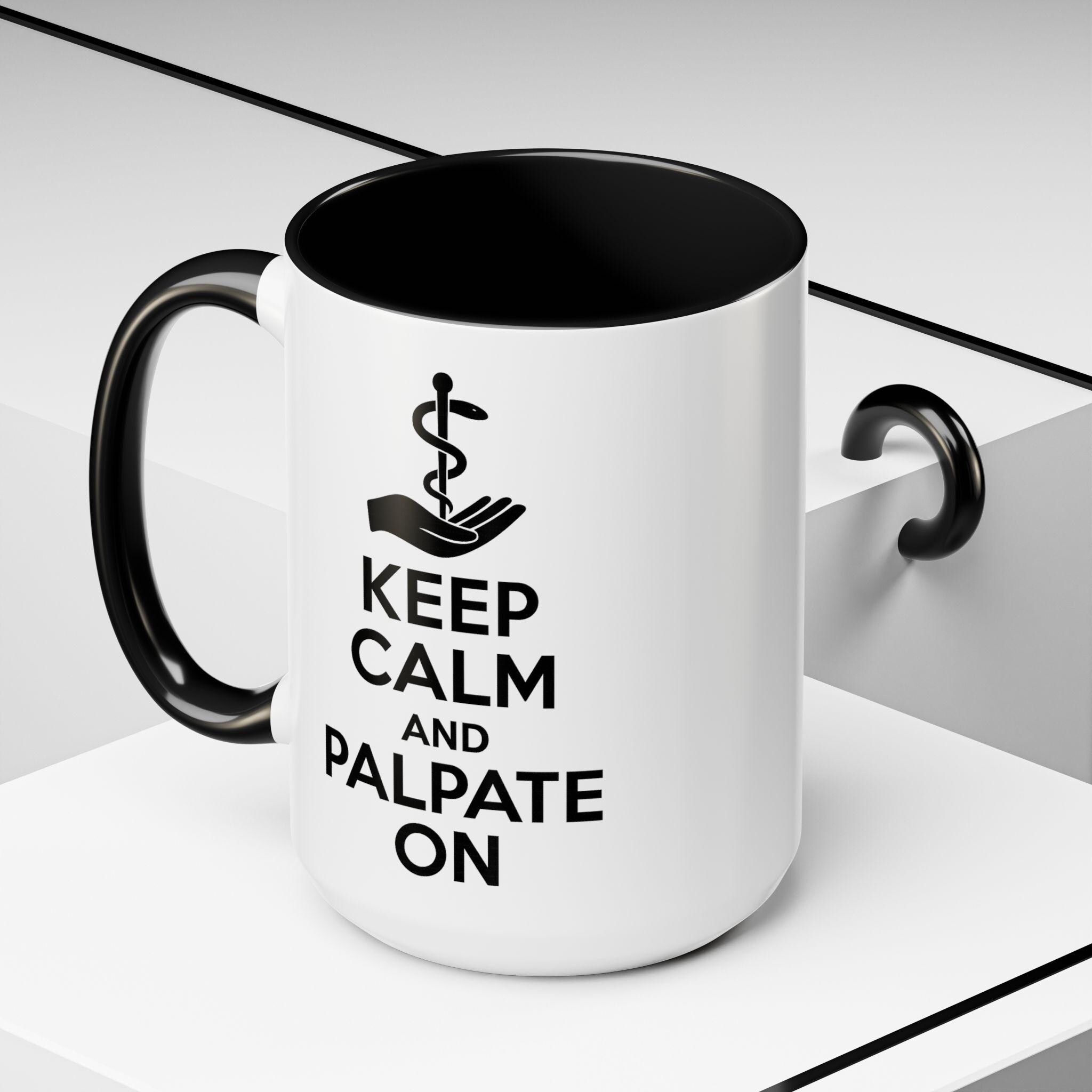 A glossy ceramic mug made to brighten up clinical mornings and late-night study sessions. Crisp black-on-white artwork reads “KEEP CALM AND PALPATE ON” alongside a simple medical emblem — a subtle nod to clinicians, nurses, and med students who live by hands-on assessment. The colored interior and handle add a touch of personality while the sturdy C-handle and two size options make it practical for large lattes, brothy soups, or strong coffee between rounds.
