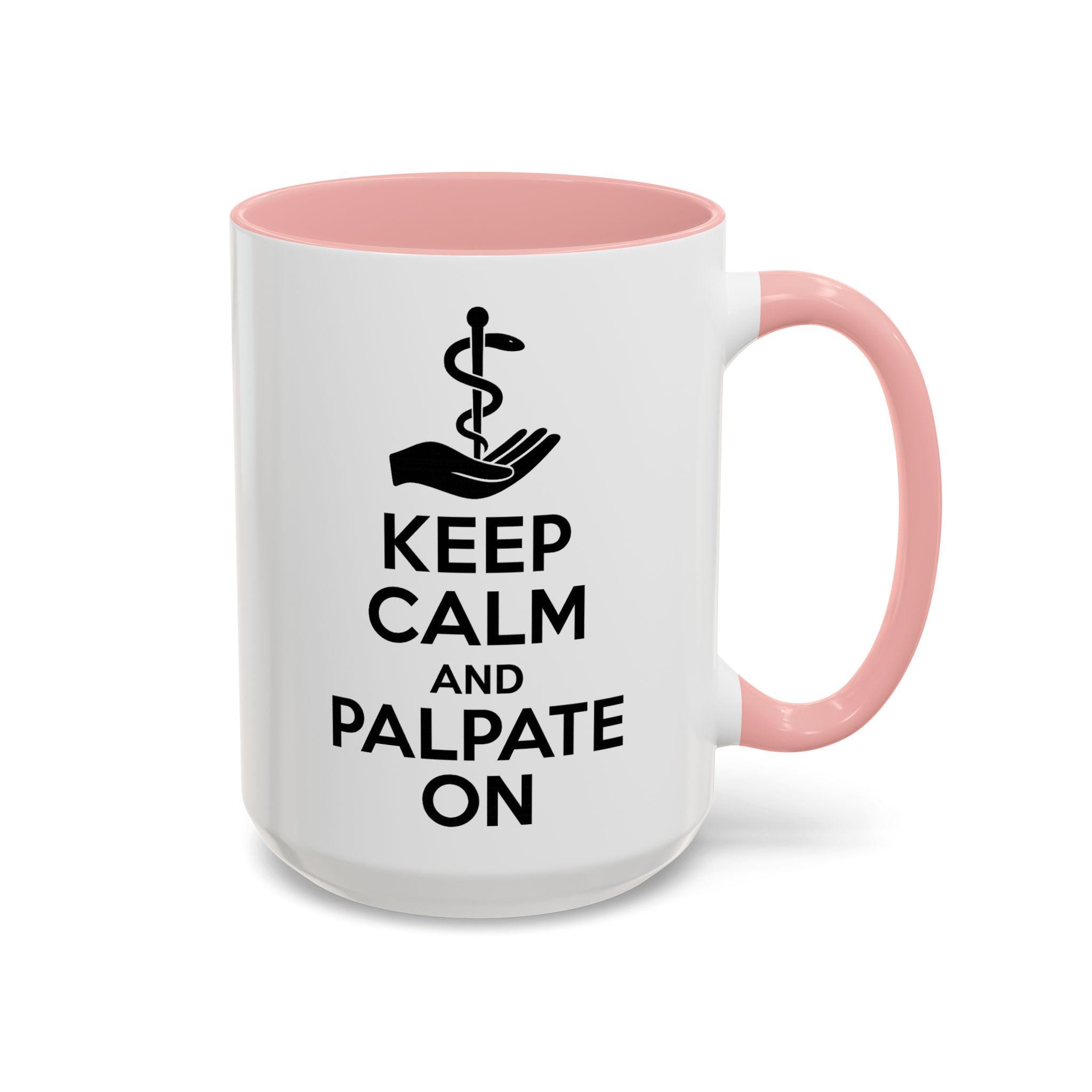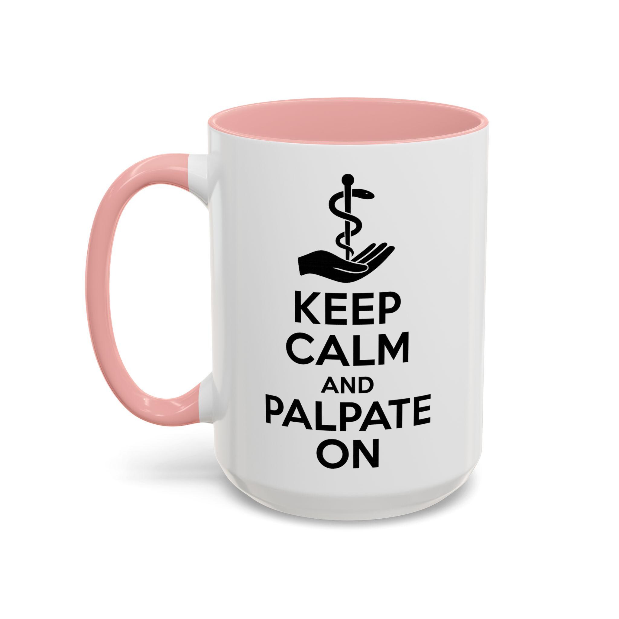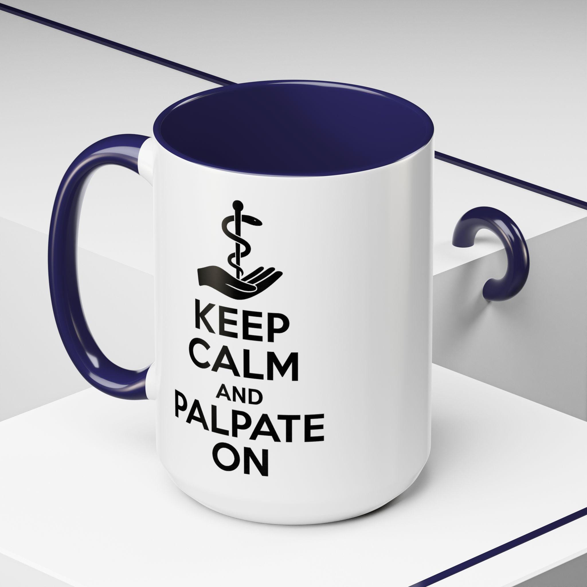 A glossy ceramic mug made to brighten up clinical mornings and late-night study sessions. Crisp black-on-white artwork reads “KEEP CALM AND PALPATE ON” alongside a simple medical emblem — a subtle nod to clinicians, nurses, and med students who live by hands-on assessment. The colored interior and handle add a touch of personality while the sturdy C-handle and two size options make it practical for large lattes, brothy soups, or strong coffee between rounds.