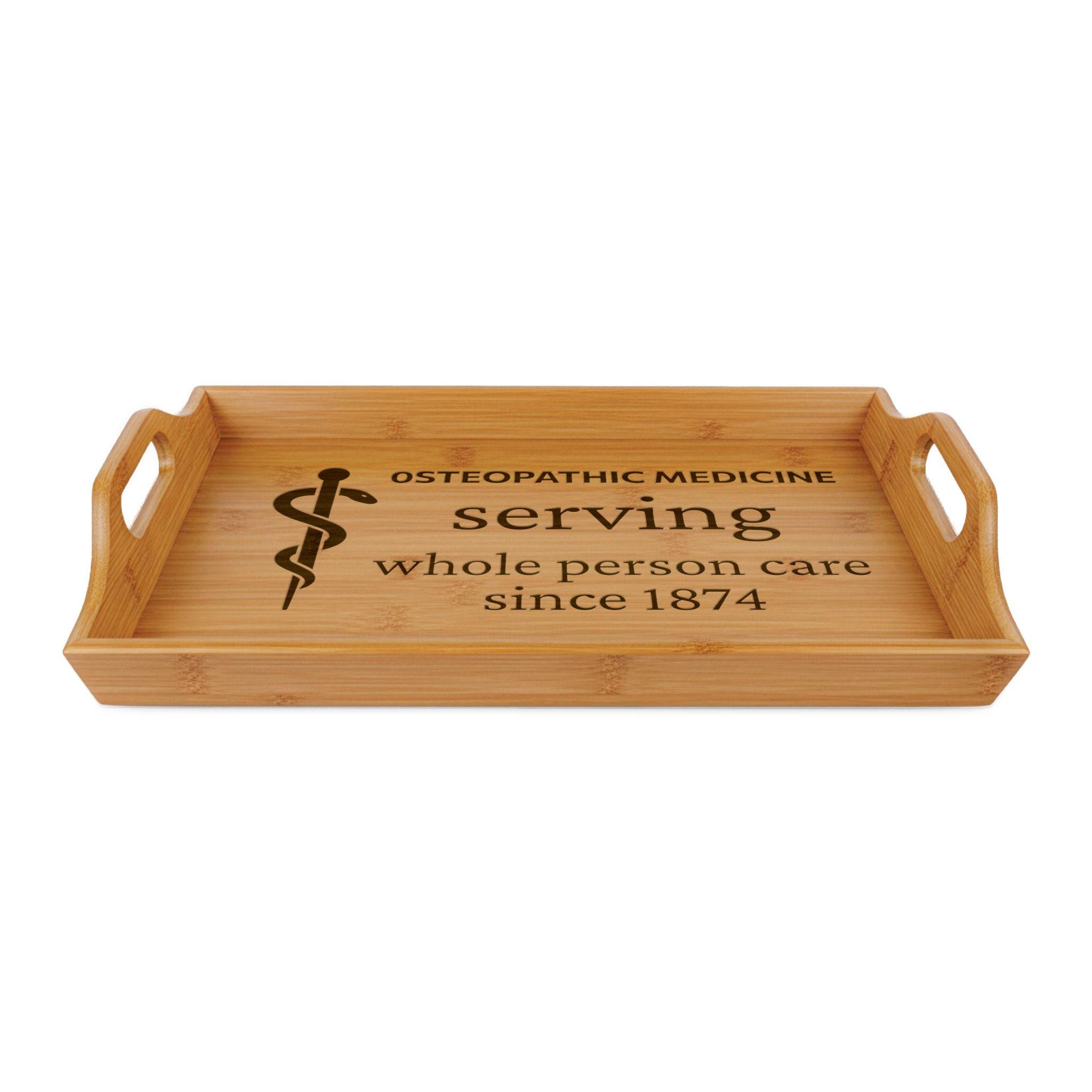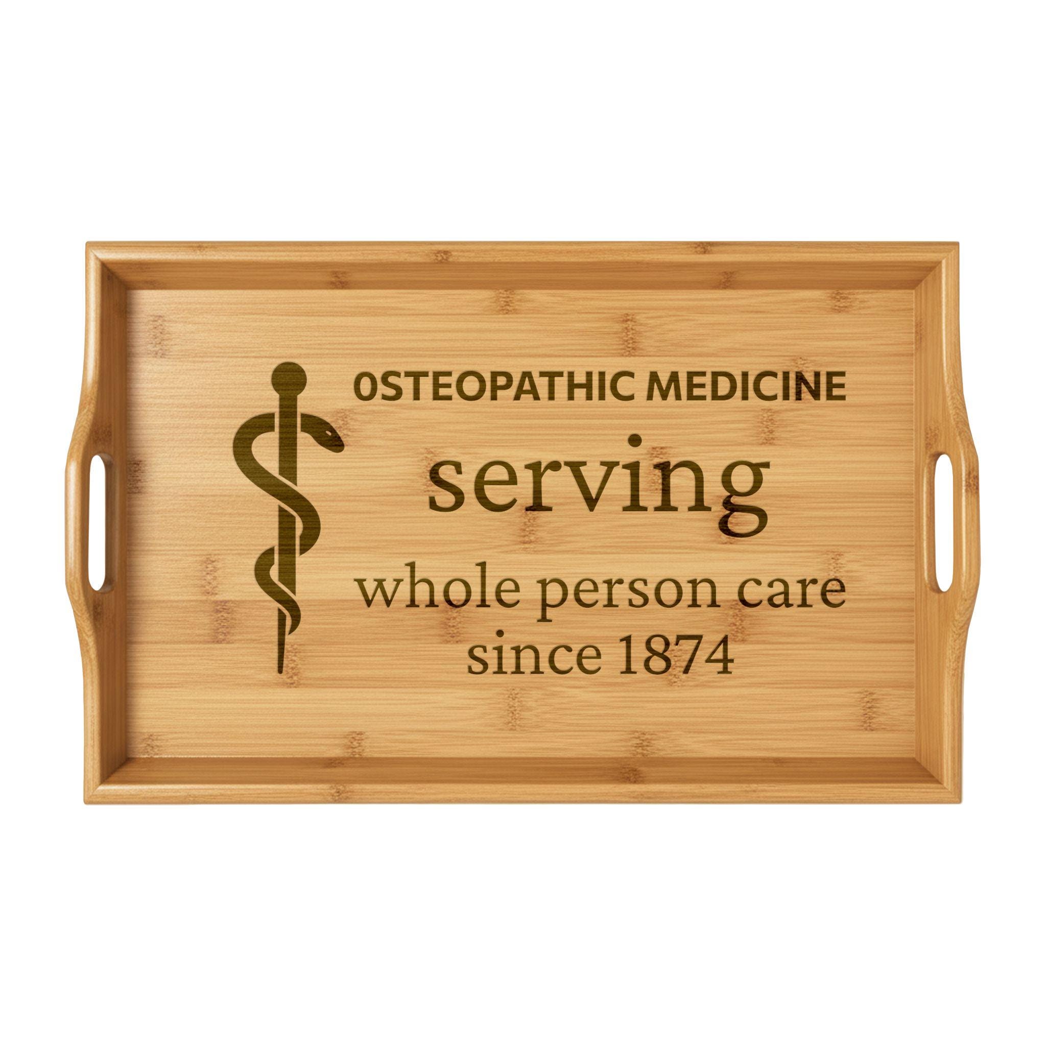 Warm, tactile, and quietly elegant — this bamboo serving tray carries a gentle message of care that speaks directly to osteopathic physicians and students. The engraved phrase “serving whole person care since 1874” sits centrally, a subtle reminder of a profession rooted in compassionate service and hands-on healing. Set it on a study desk with a mug and notebook between shifts, or bring it into a clinic reception to hold business cards and a calming plant. The smooth bamboo surface ages with use, taking on a lived-in patina that feels personal and intentional. Each time it’s picked up it connects the everyday task of serving to a deeper commitment to whole-person medicine.