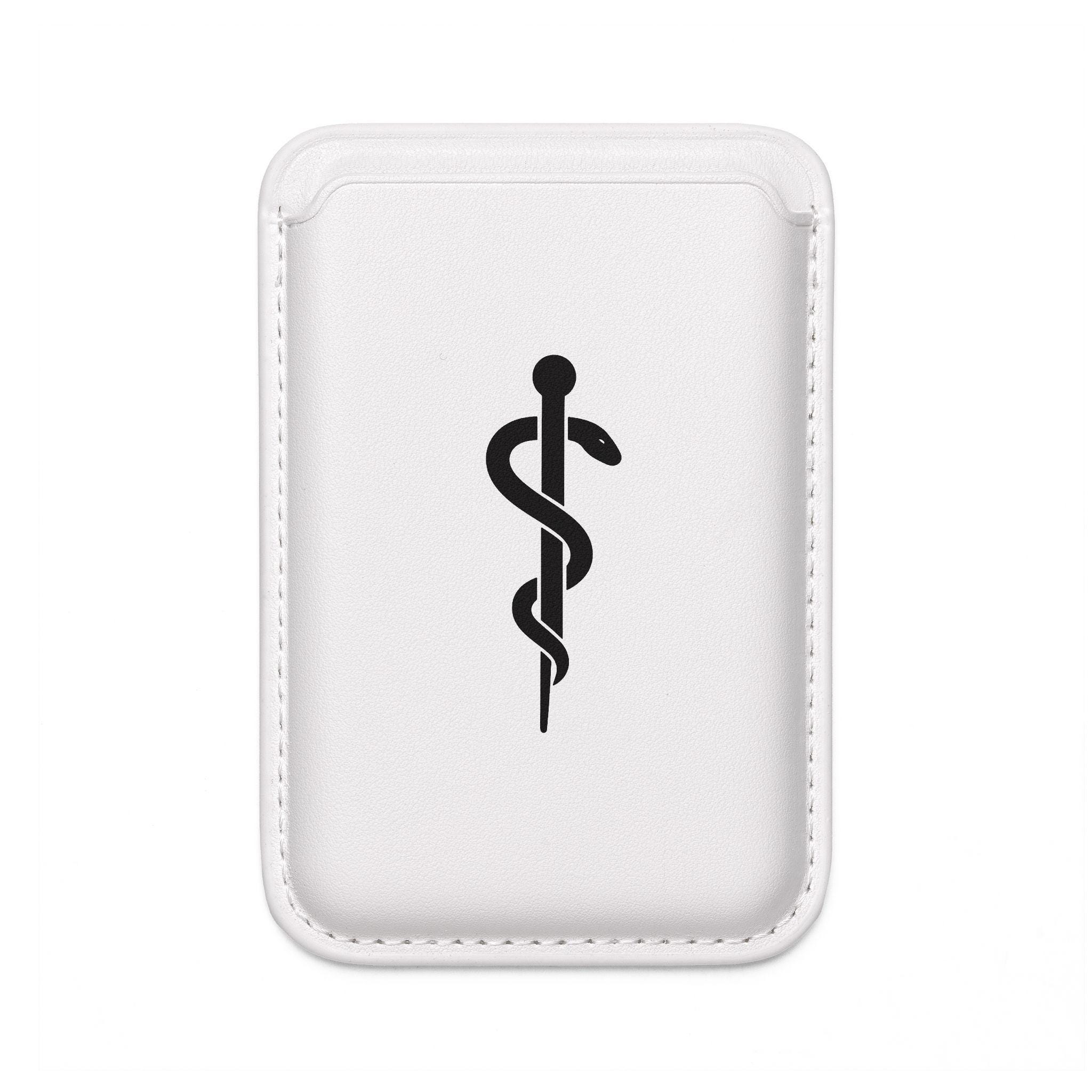Lightweight, vegan-friendly wallet with a sleek medical-inspired accent. The Rod of Asclepius motif is printed in against a black or white vegan PU leather body, adding a subtle nod to osteopathy and healthcare work. It holds up to two cards securely with a quick-release magnetic closure and is MagSafe® compatible so it snaps onto compatible phone wallets or cases. Carry it on shifts, between clinics, or out for a quick coffee — it’s compact enough to slide into a scrub pocket or small bag while still showing a little professional pride.