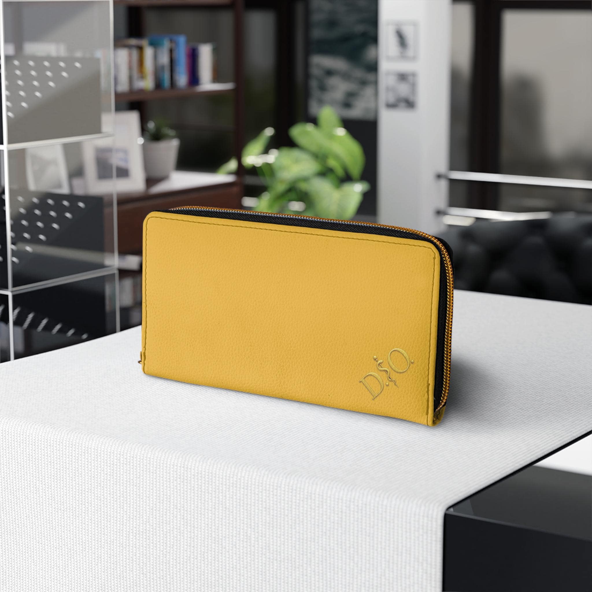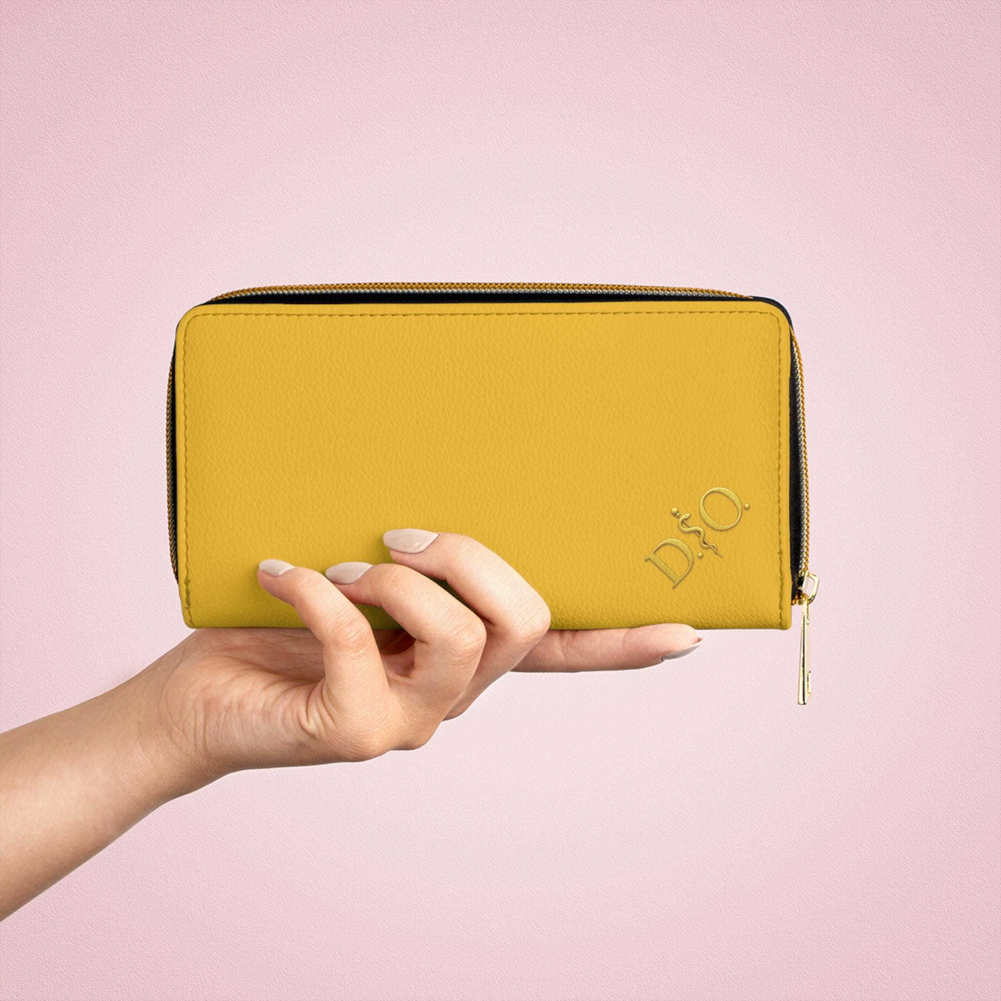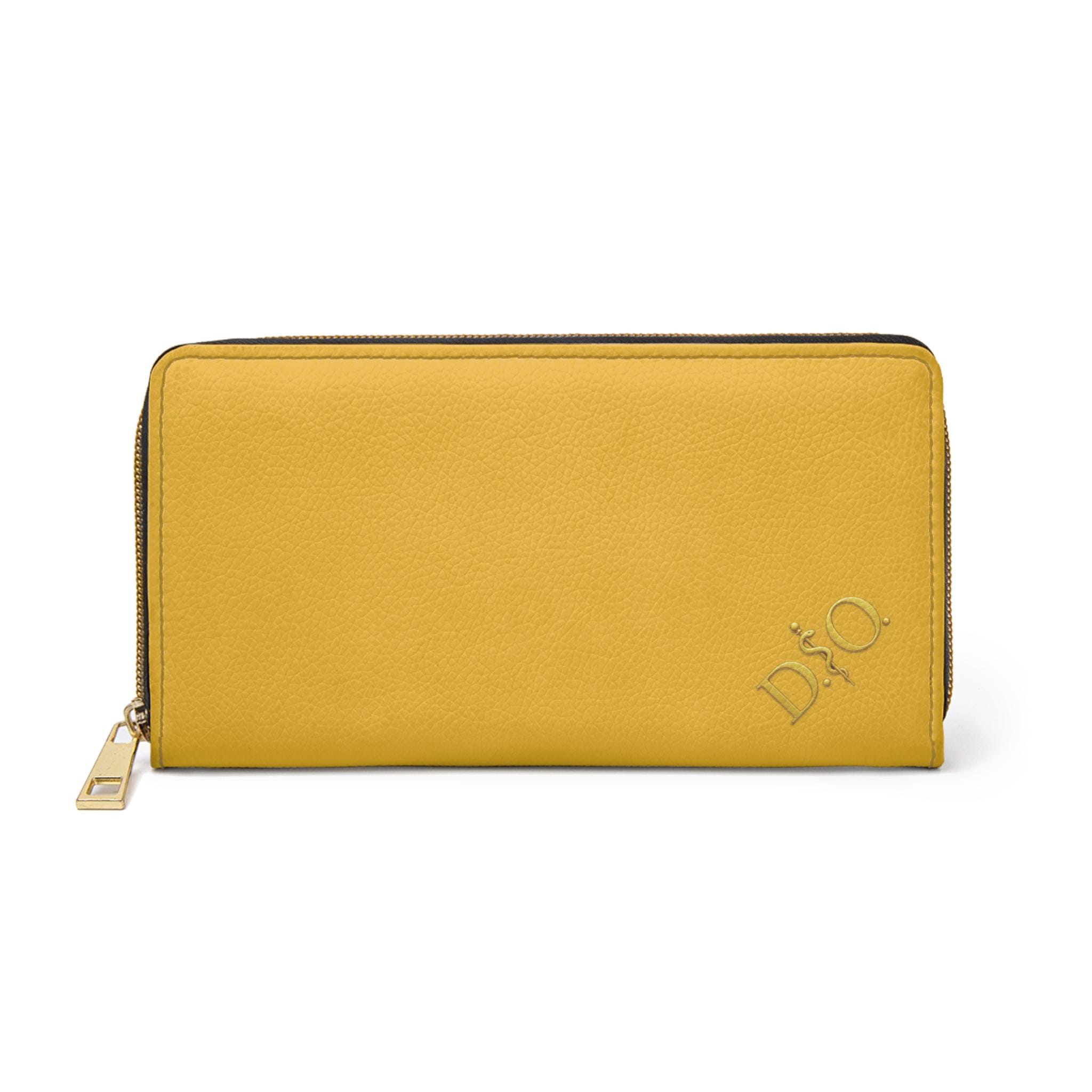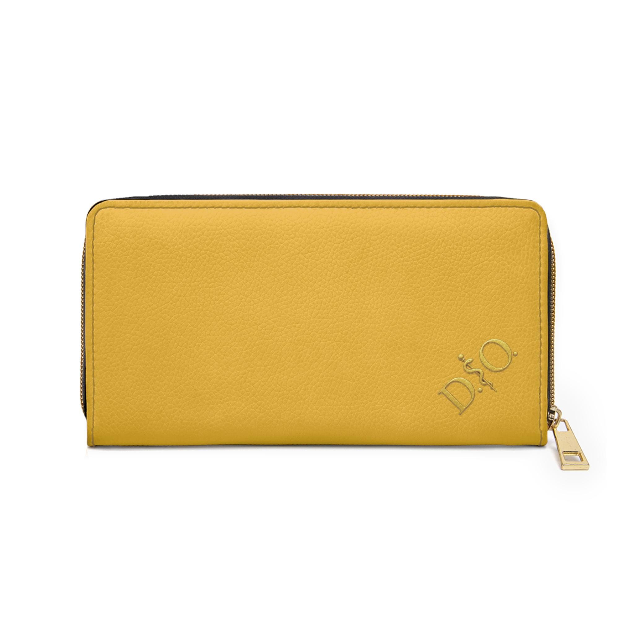 This yellow leather zipper wallet carries a refined medical-osteopathic presence with a gold DO Asclepius monogram in the corner that gives it a designer air. Clean, polished, and quietly authoritative, it slides into a clinician’s daily rhythm — from morning rounds to after-hours note-taking. The gold emblem pops against the striking yellow surface, a subtle nod to professional pride without being loud. It lives in lab coats and scrub pockets, but also in briefcases and tote bags, bridging clinical work with everyday errands. Thoughtful pockets keep cash, cards, coins, and a slim checkbook organized. The smooth PU leather and shimmering gold-thread stitching add tactile and visual luxury, while a sturdy nylon zipper and alloy hardware stand up to constant use. For osteopaths, medical students, and healthcare pros who prefer understated, professional accessories, this wallet feels familiar, respected, and made to travel through long shifts and meaningful patient moments.