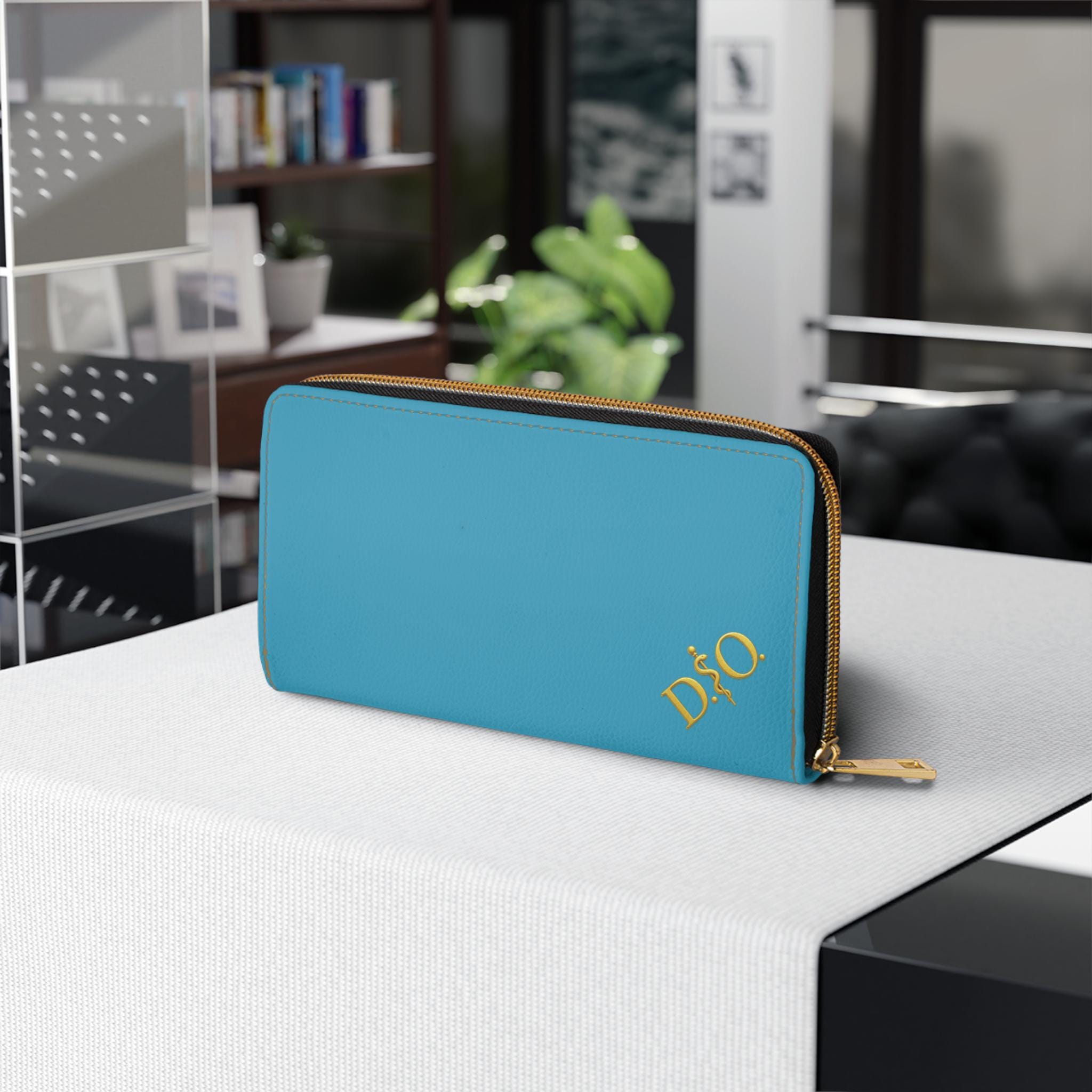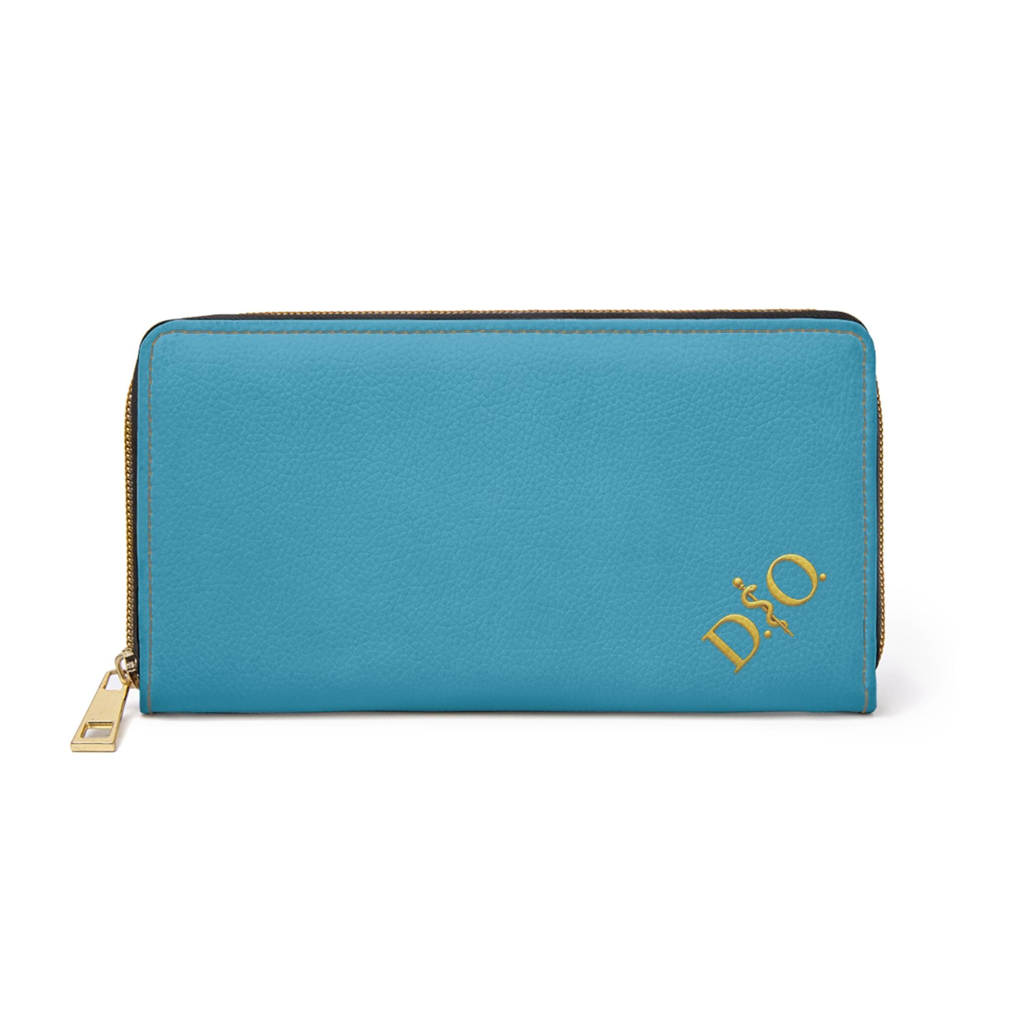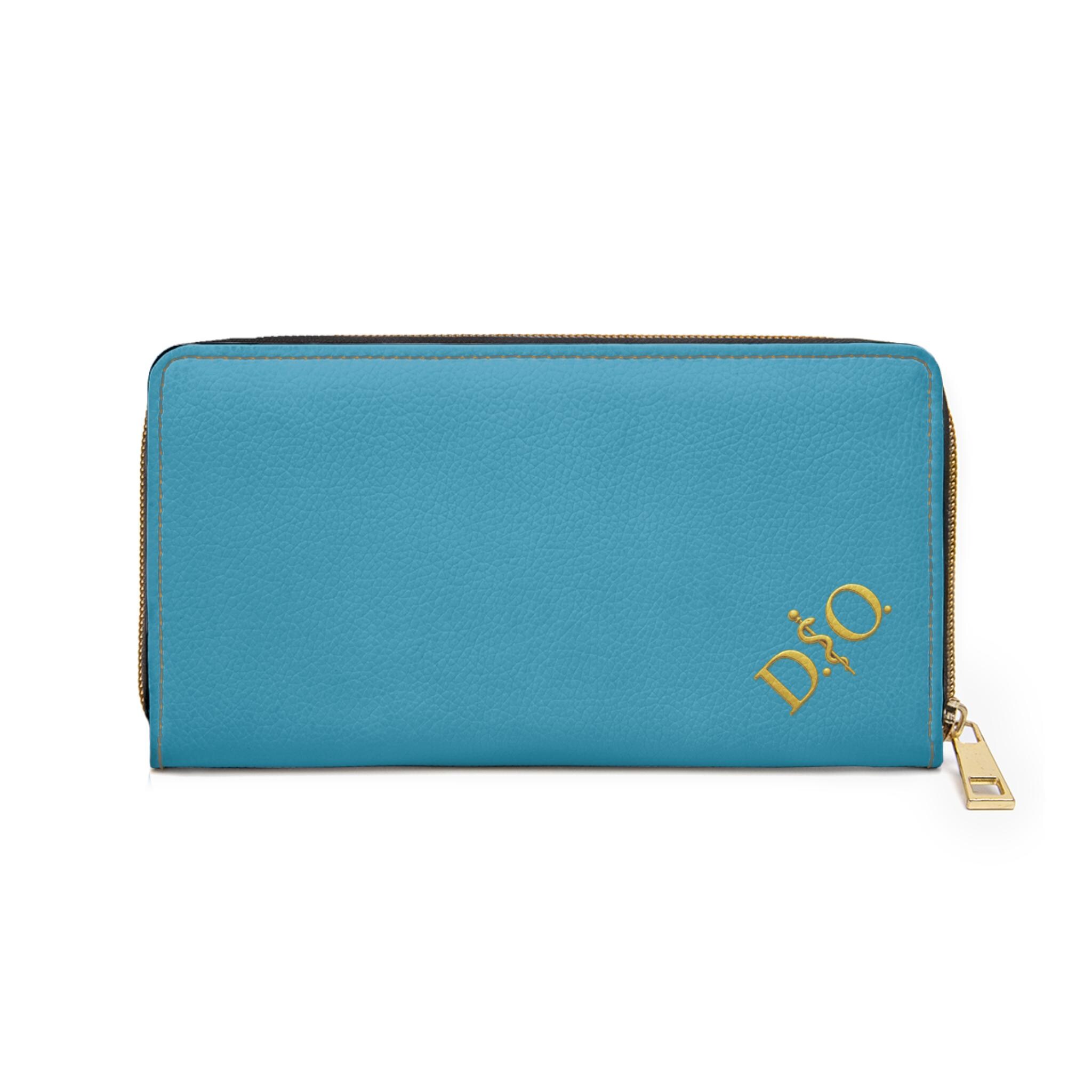 This turquoise leather zipper wallet carries a refined medical-osteopathic presence with a gold DO Asclepius monogram in the corner that gives it a designer air. Clean, polished, and quietly authoritative, it slides into a clinician’s daily rhythm — from morning rounds to after-hours note-taking. The gold emblem pops against the striking turquoise surface, a subtle nod to professional pride without being loud. It lives in lab coats and scrub pockets, but also in briefcases and tote bags, bridging clinical work with everyday errands. Thoughtful pockets keep cash, cards, coins, and a slim checkbook organized. The smooth PU leather and shimmering gold-thread stitching add tactile and visual luxury, while a sturdy nylon zipper and alloy hardware stand up to constant use. For osteopaths, medical students, and healthcare pros who prefer understated, professional accessories, this wallet feels familiar, respected, and made to travel through long shifts and meaningful patient moments.
