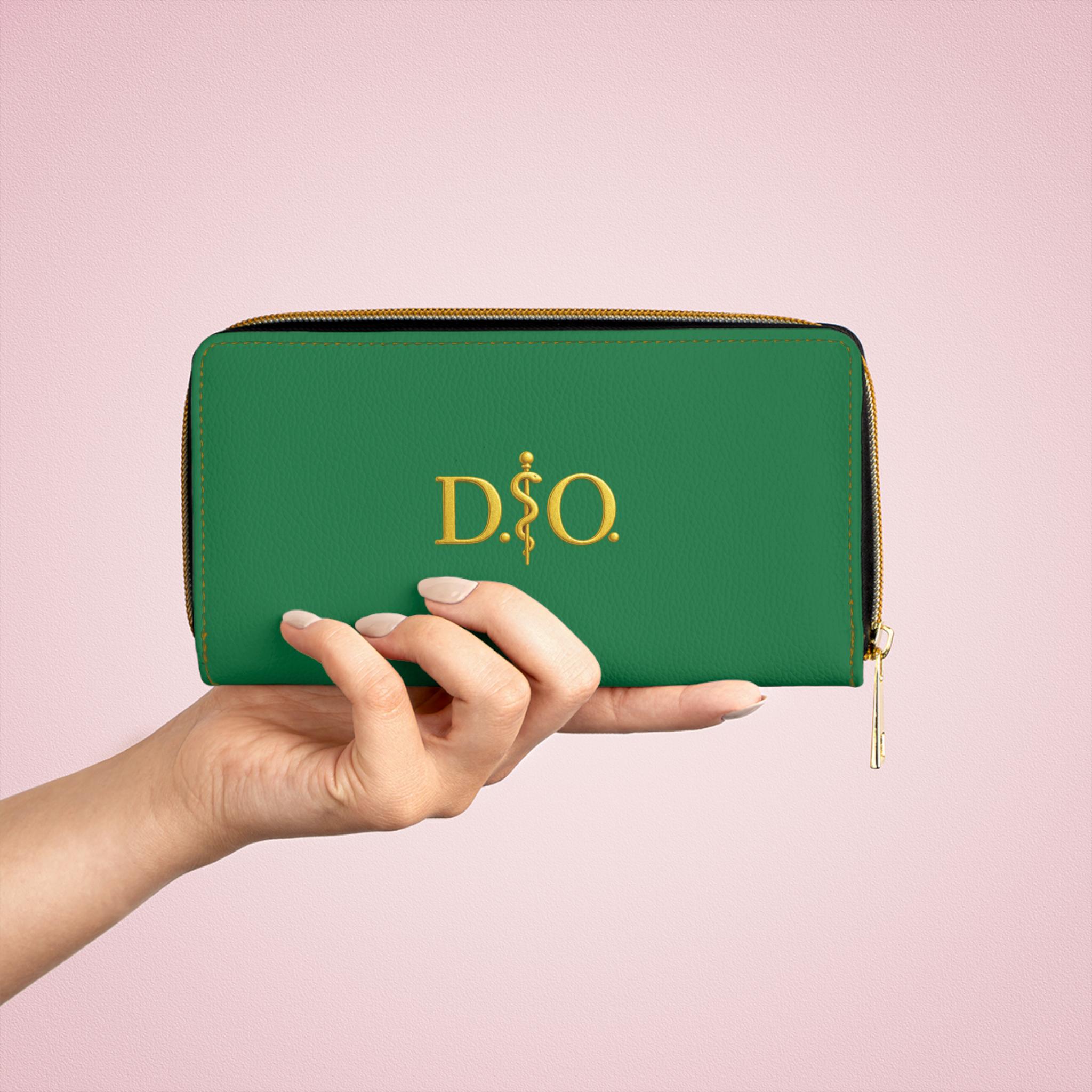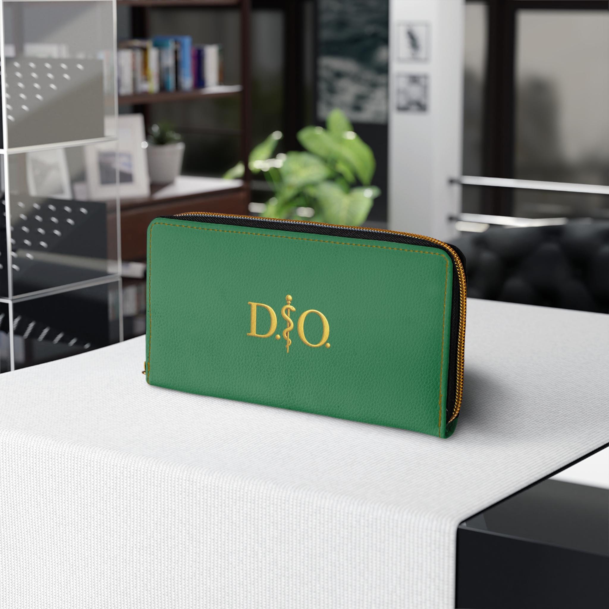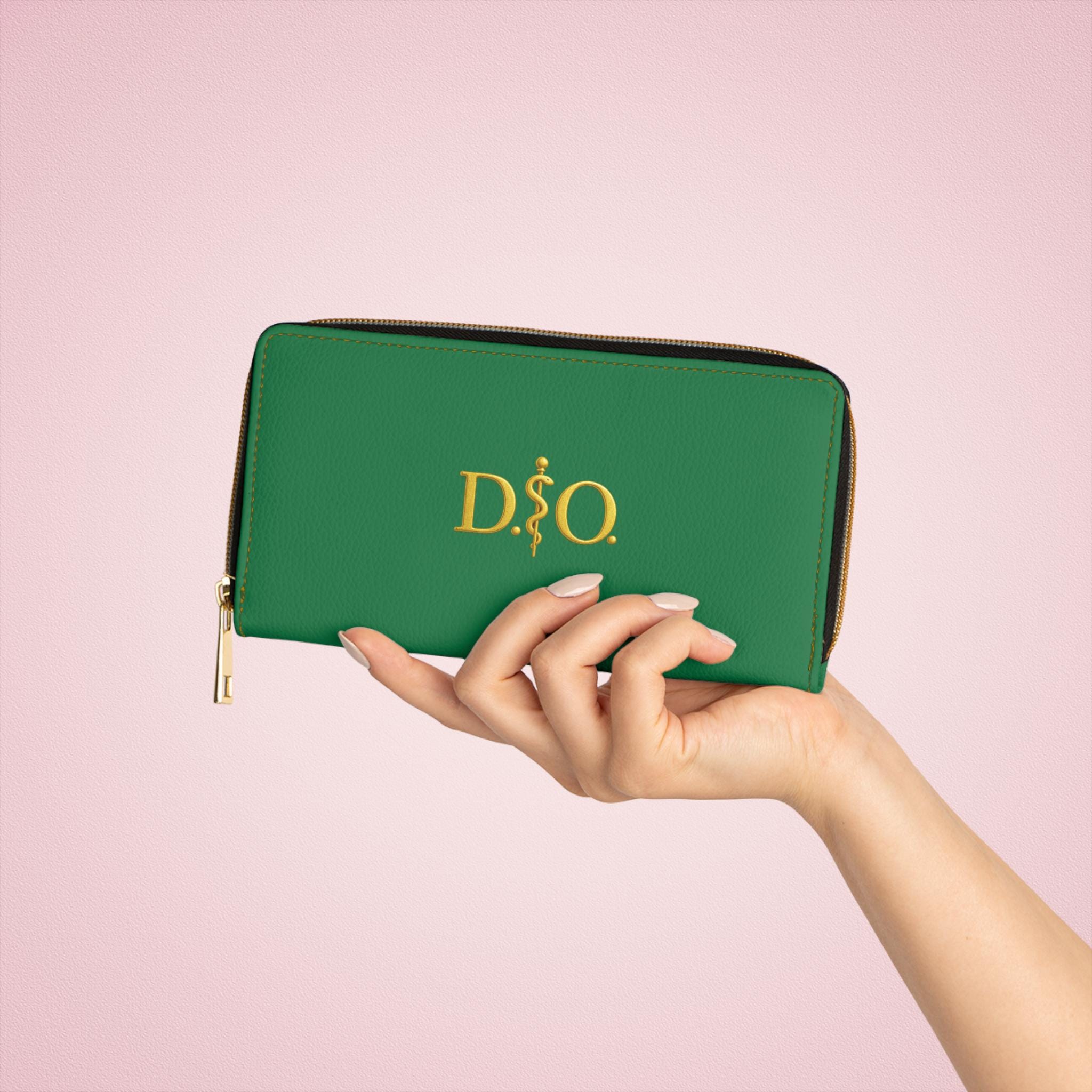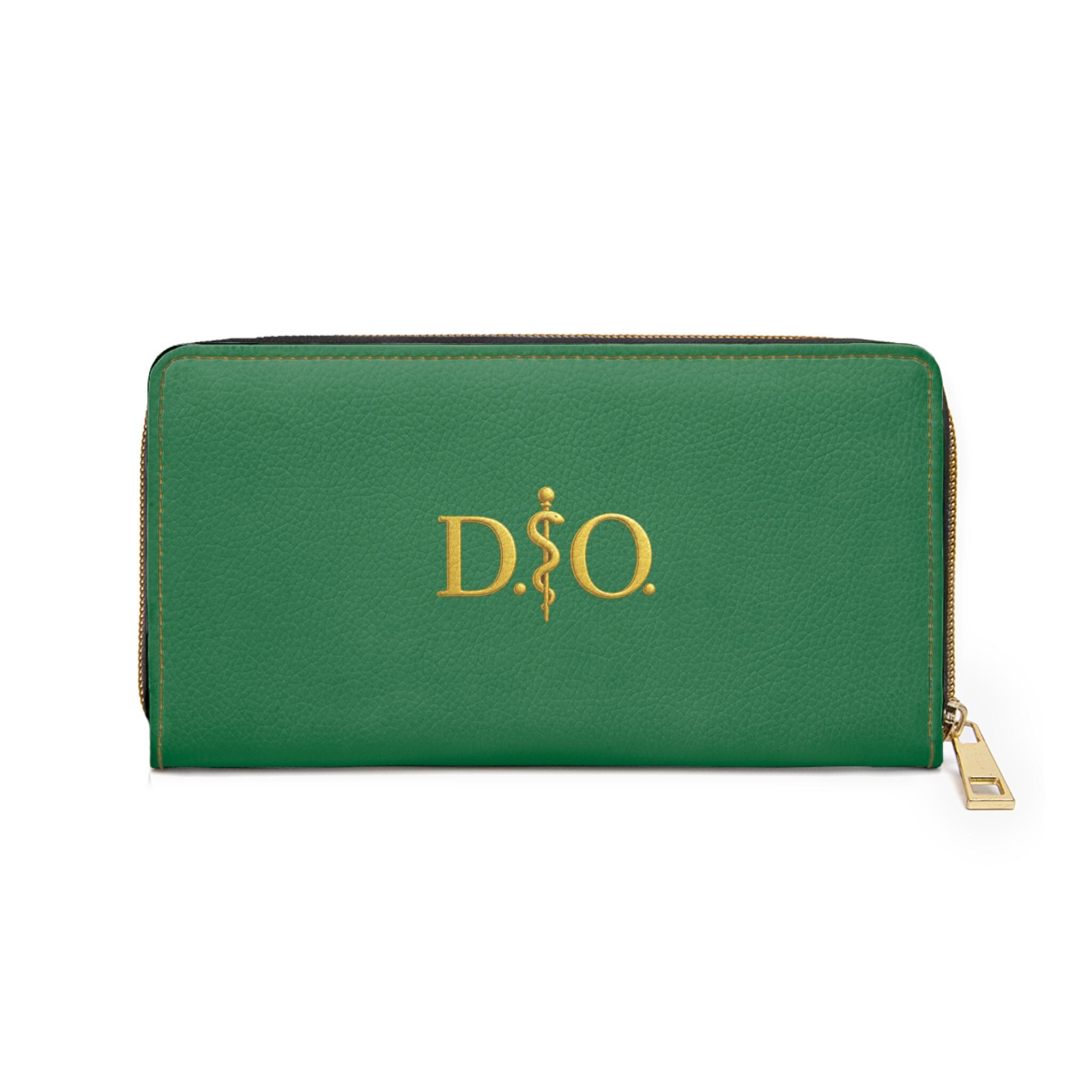 This green leather zipper wallet carries a refined medical-osteopathic presence with a gold Asclepius monogram as its focal point. Clean, polished, and quietly authoritative, it slides into a clinician’s daily rhythm — from morning rounds to after-hours note-taking. The gold emblem pops against the colorful green surface, a subtle nod to professional pride without being loud. It lives in lab coats and scrub pockets, but also in briefcases and tote bags, bridging clinical work with everyday errands. Thoughtful pockets keep cash, cards, coins, and a slim checkbook organized. The smooth PU leather and shimmering gold-thread stitching add tactile and visual luxury, while a sturdy nylon zipper and alloy hardware stand up to constant use. For osteopaths, medical students, and healthcare pros who prefer understated, professional accessories, this wallet feels familiar, respected, and made to travel through long shifts and meaningful patient moments.