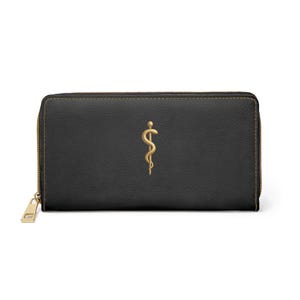 This brown leather zipper wallet carries a refined medical-osteopathic presence with a gold Asclepius monogram as its focal point. Clean, polished, and quietly authoritative, it slides into a clinician’s daily rhythm — from morning rounds to after-hours note-taking. The gold emblem pops against the warm brown surface, a subtle nod to professional pride without being loud. It lives in lab coats and scrub pockets, but also in briefcases and tote bags, bridging clinical work with everyday errands. Thoughtful pockets keep cash, cards, coins, and a slim checkbook organized. The smooth PU leather and shimmering gold-thread stitching add tactile and visual luxury, while a sturdy nylon zipper and alloy hardware stand up to constant use. For osteopaths, medical students, and healthcare pros who prefer understated, professional accessories, this wallet feels familiar, respected, and made to travel through long shifts and meaningful patient moments.