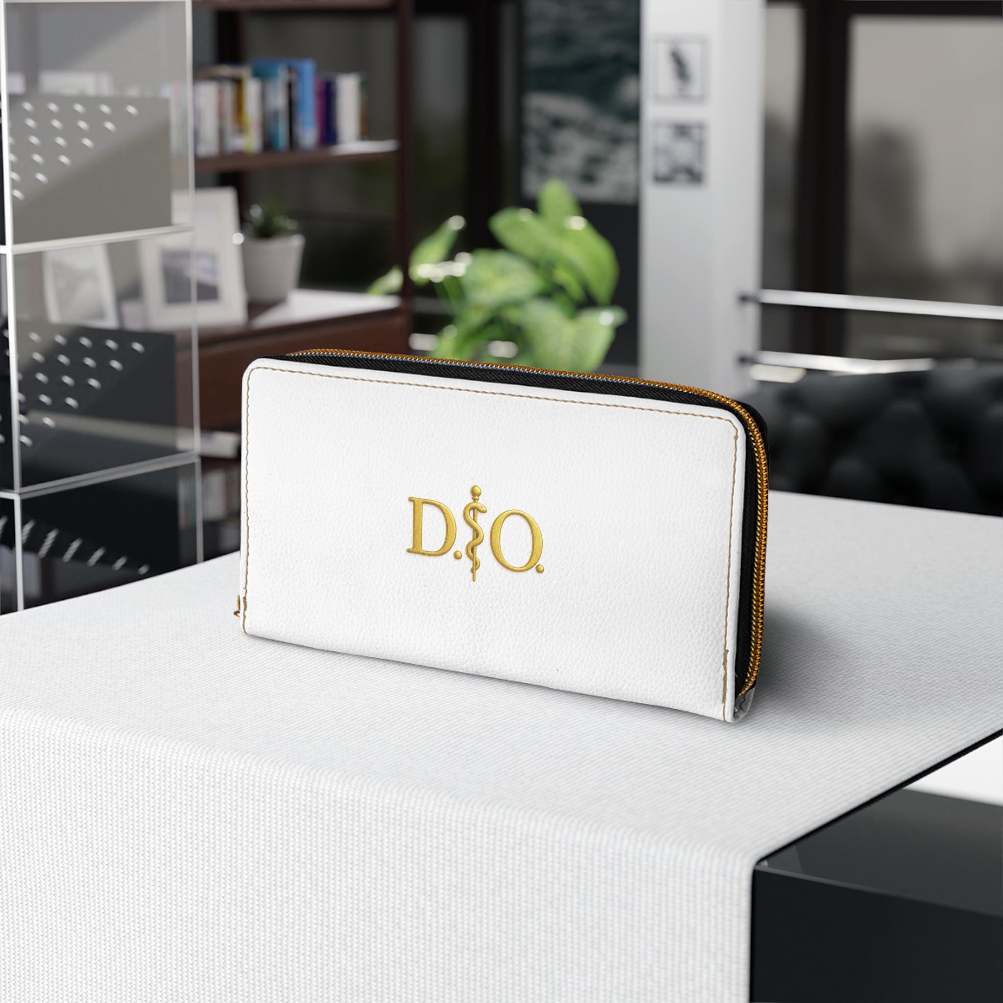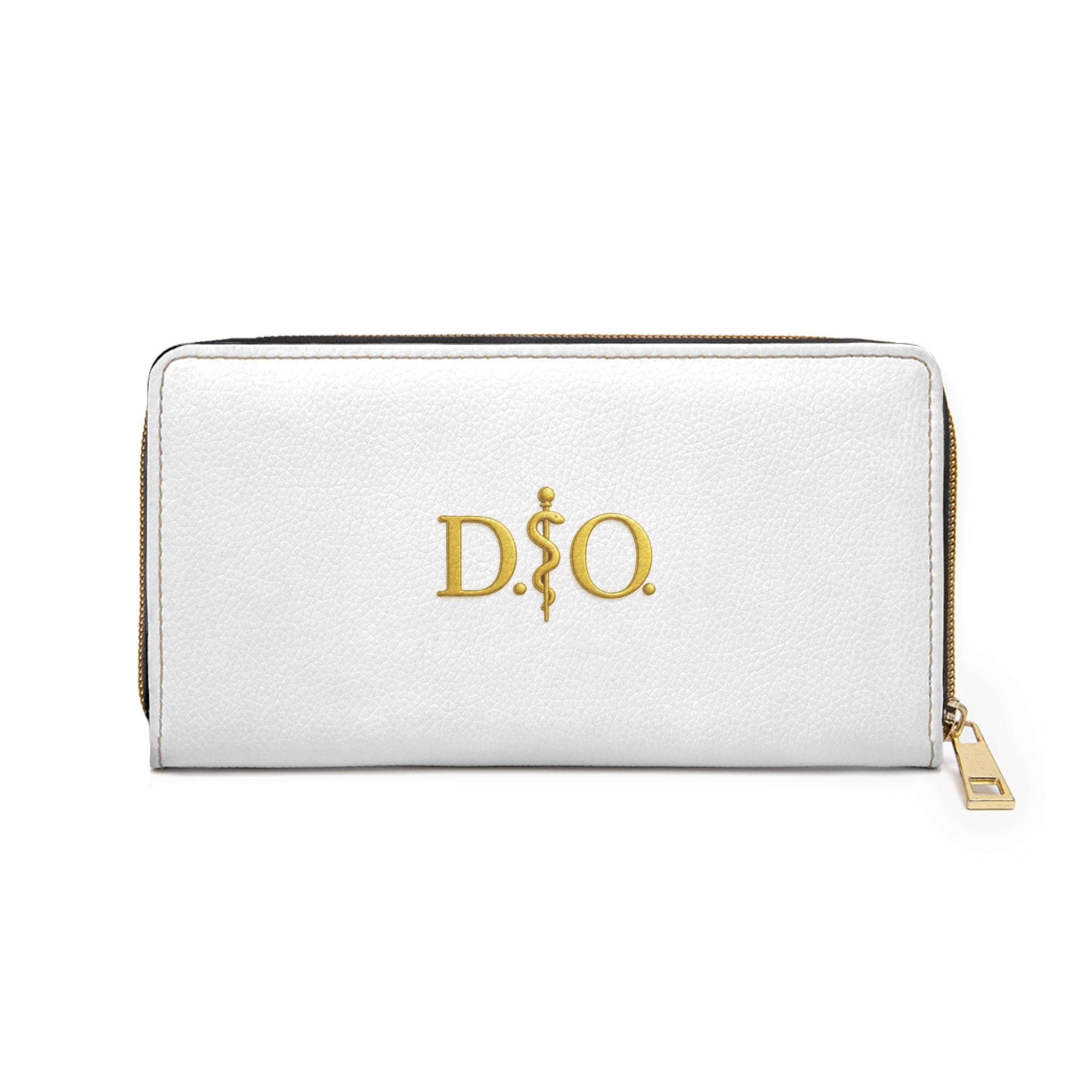 This white leather zipper wallet carries a refined medical-osteopathic presence with a gold Asclepius monogram as its focal point. Clean, polished, and quietly authoritative, it slides into a clinician’s daily rhythm — from morning rounds to after-hours note-taking. The gold emblem pops against the crisp white surface, a subtle nod to professional pride without being loud. It lives in lab coats and scrub pockets, but also in briefcases and tote bags, bridging clinical work with everyday errands. Thoughtful pockets keep cash, cards, coins, and a slim checkbook organized. The smooth PU leather and shimmering gold-thread stitching add tactile and visual luxury, while a sturdy nylon zipper and alloy hardware stand up to constant use. For osteopaths, medical students, and healthcare pros who prefer understated, professional accessories, this wallet feels familiar, respected, and made to travel through long shifts and meaningful patient moments.