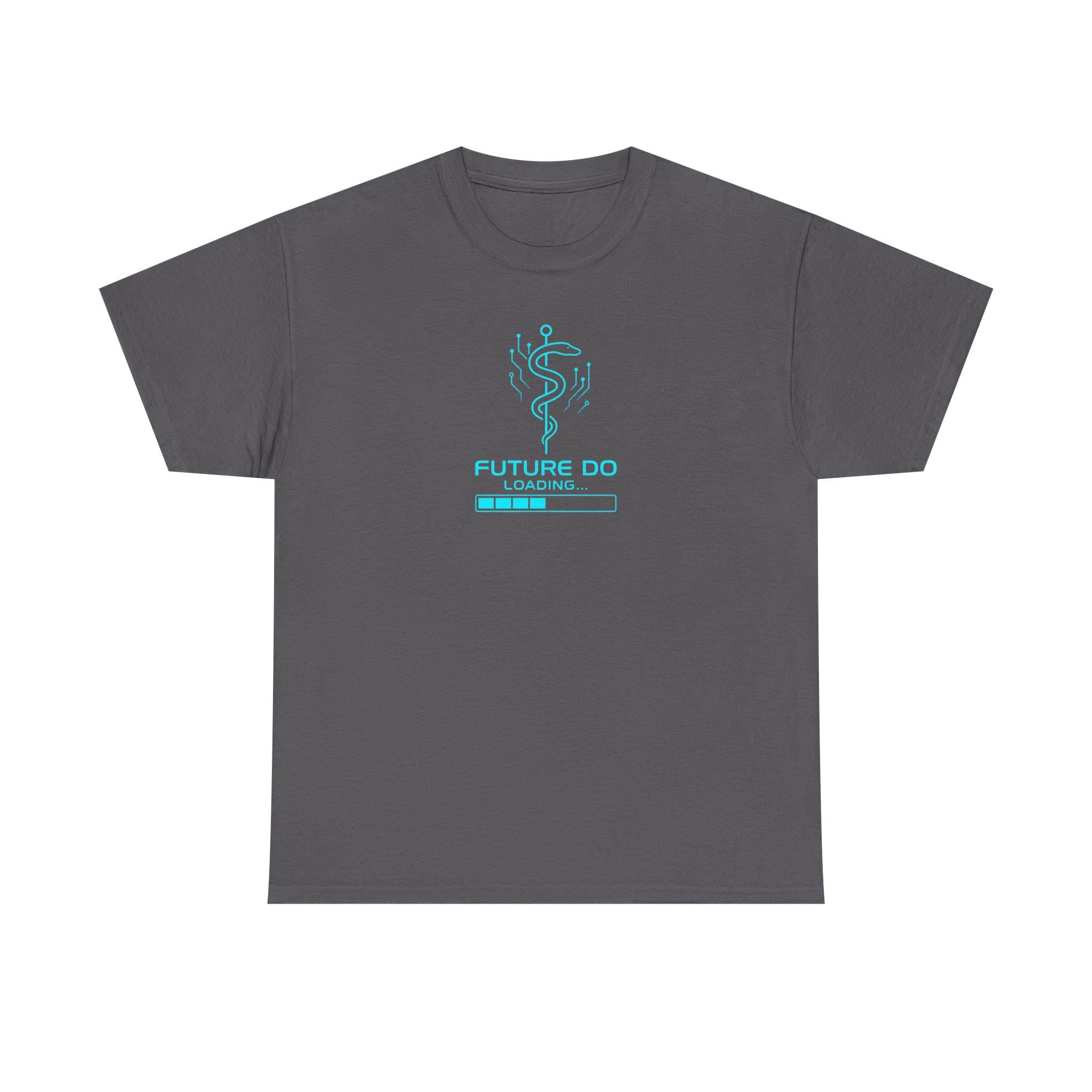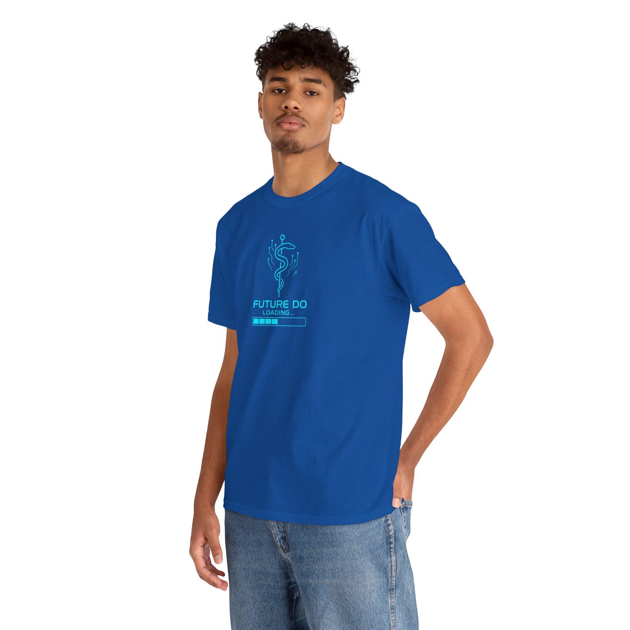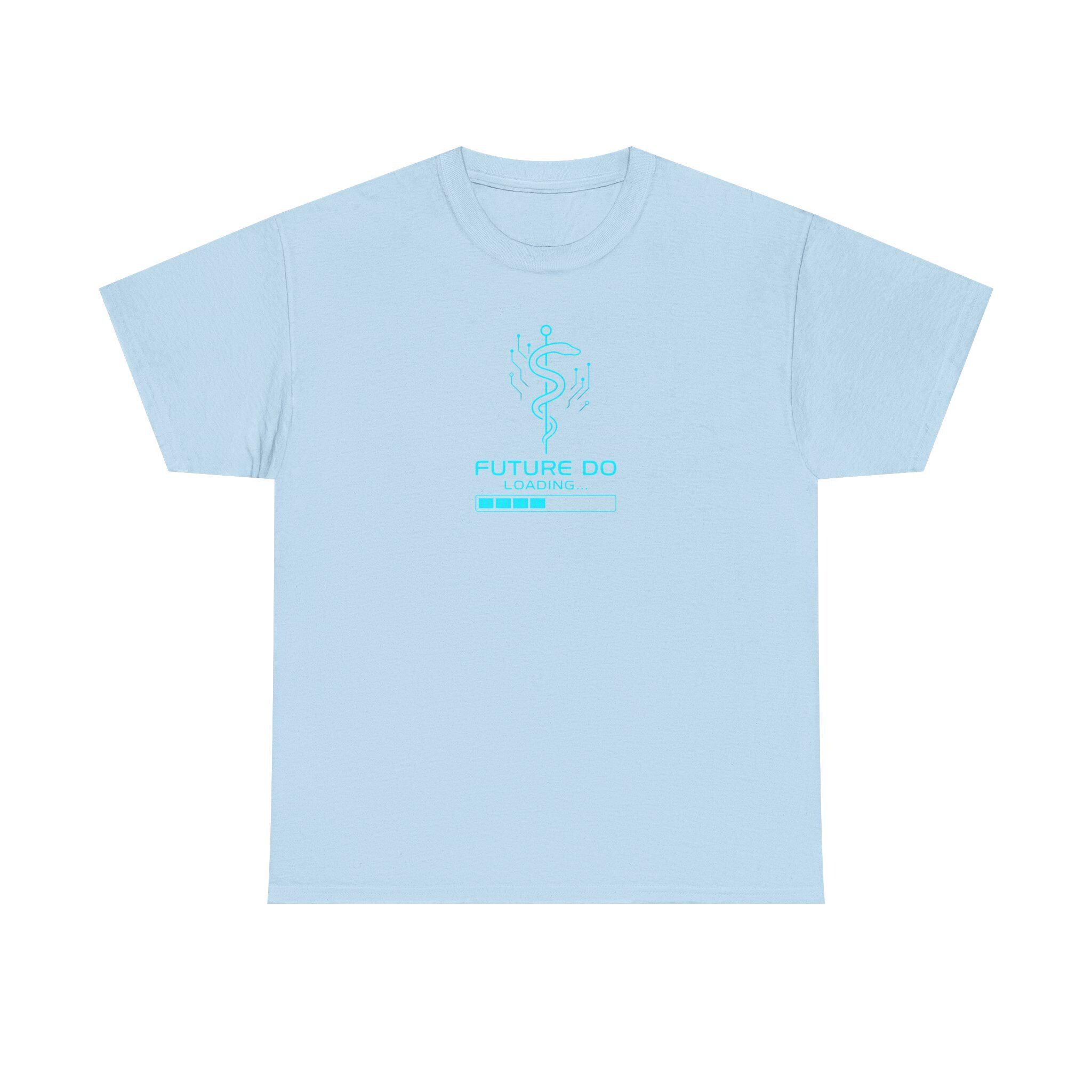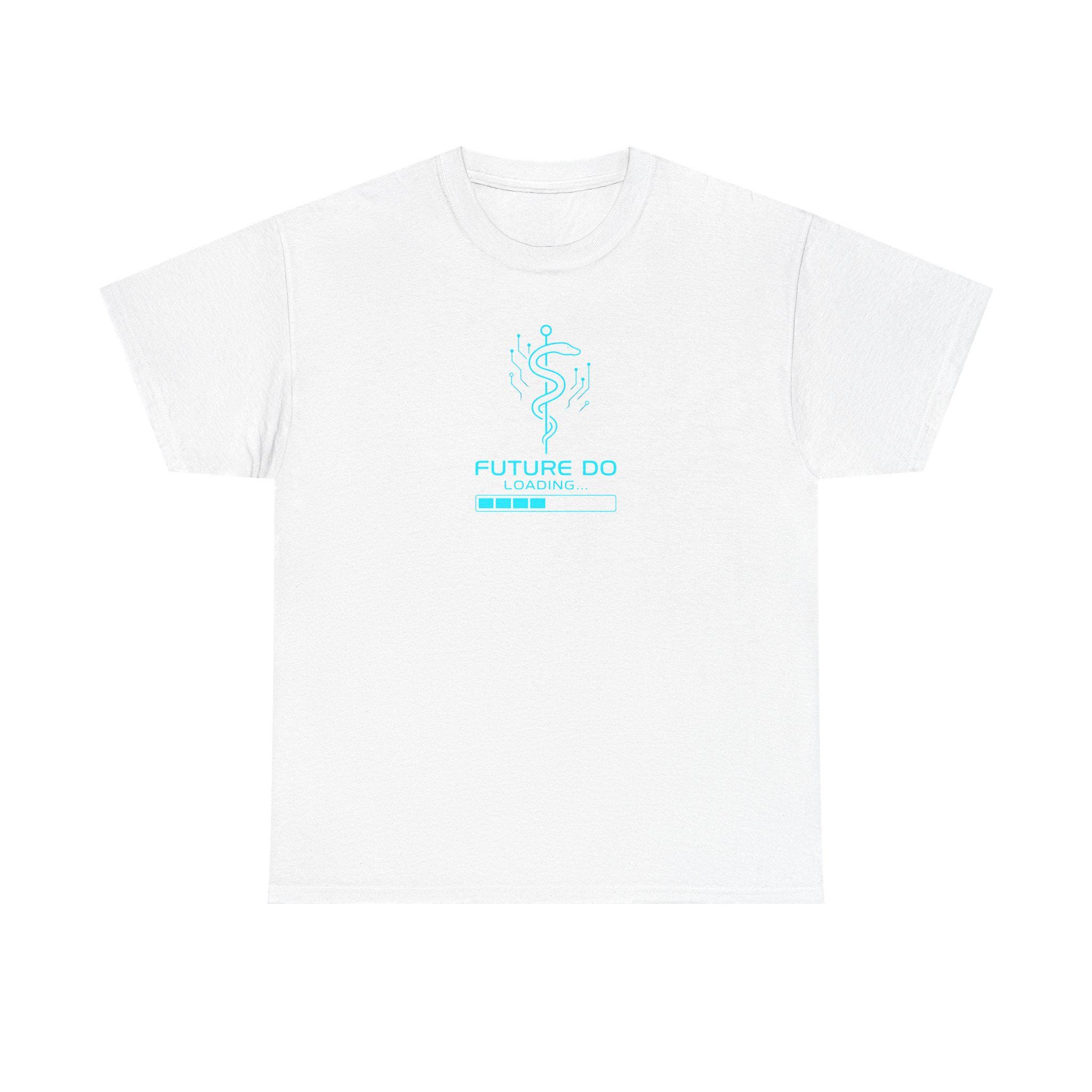 A crisp white classic-fit tee printed with a cool, tech-inspired medical graphic — a modernized caduceus made of circuitry above a progress bar that reads “FUTURE DO / LOADING.” Lightweight yet durable cotton feels smooth against skin and holds bright DTG/DTF prints with sharp detail. Wear it to study sessions, clinical rotations, or casual campus days to quietly announce ambition and the long road of training ahead. The minimalist blue artwork keeps the message optimistic and playful, while the sturdy construction and ribbed crew neck give everyday comfort and shape retention.