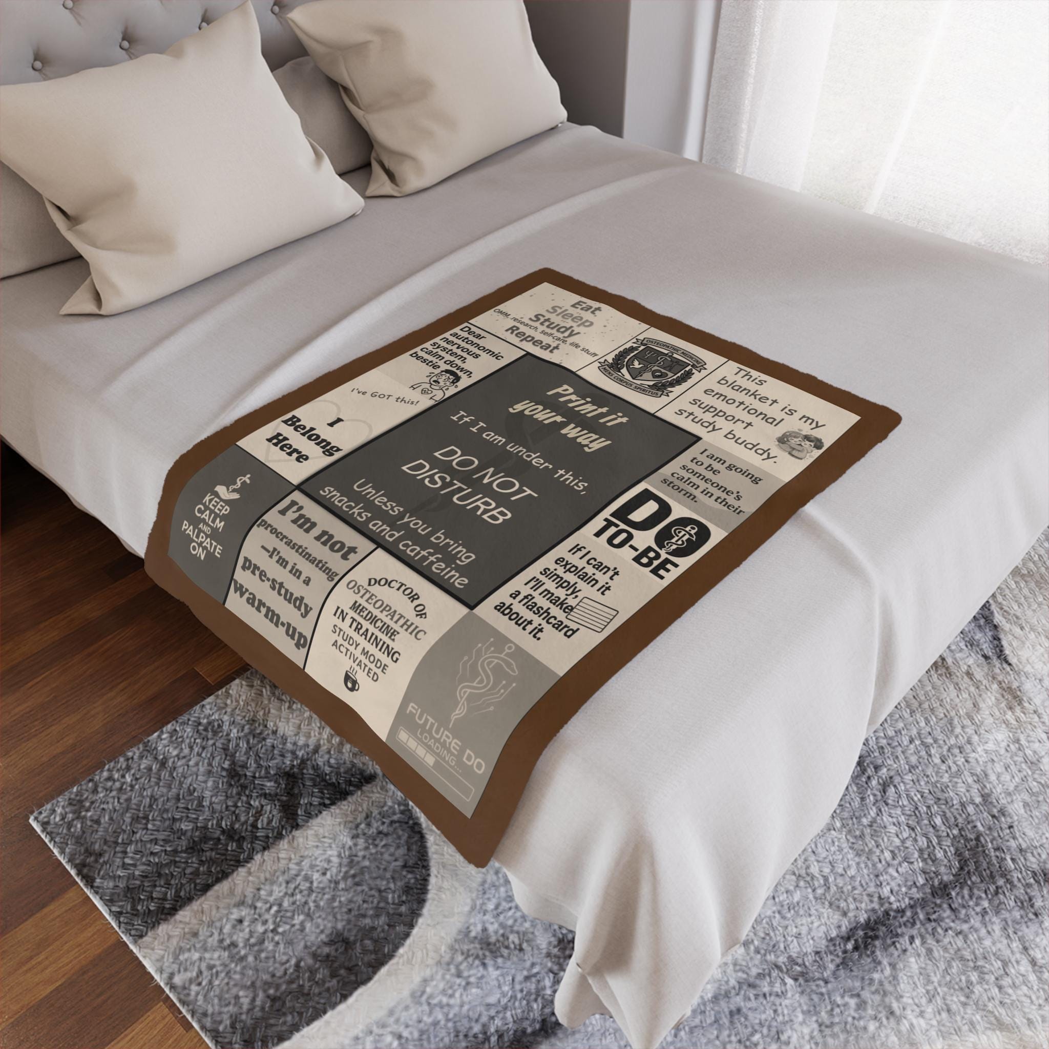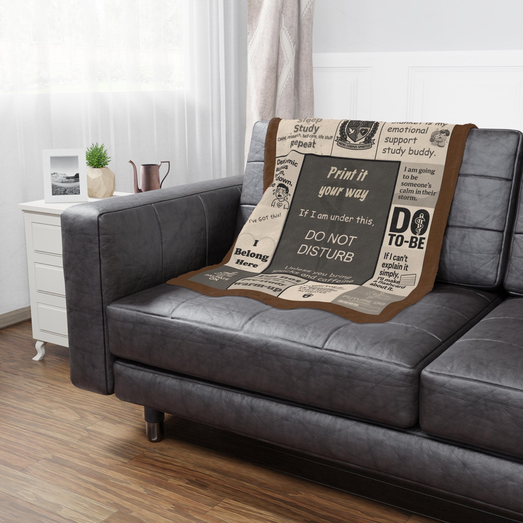 A compact, cozy minky blanket with DO student affirmations and humor, designed for late-night study sessions and long library days. Soft, plush polyester wraps around you like a focused hush — warm, muffled, and a little nostalgic. The one-sided print arranges study-mantras, cheeky med-school jokes, and calming reminders into a patchwork of encouragement. It settles over shoulders during cram sessions, drapes across a dorm bed, or folds into a backpack for quick comfort between lectures. The muted, vintage-inspired palette keeps the look calm and academic while the flat-stitched edges hold up to repeated use and washes. This blanket feels like a steady study partner: supportive, familiar, and quietly motivating when focus matters most.