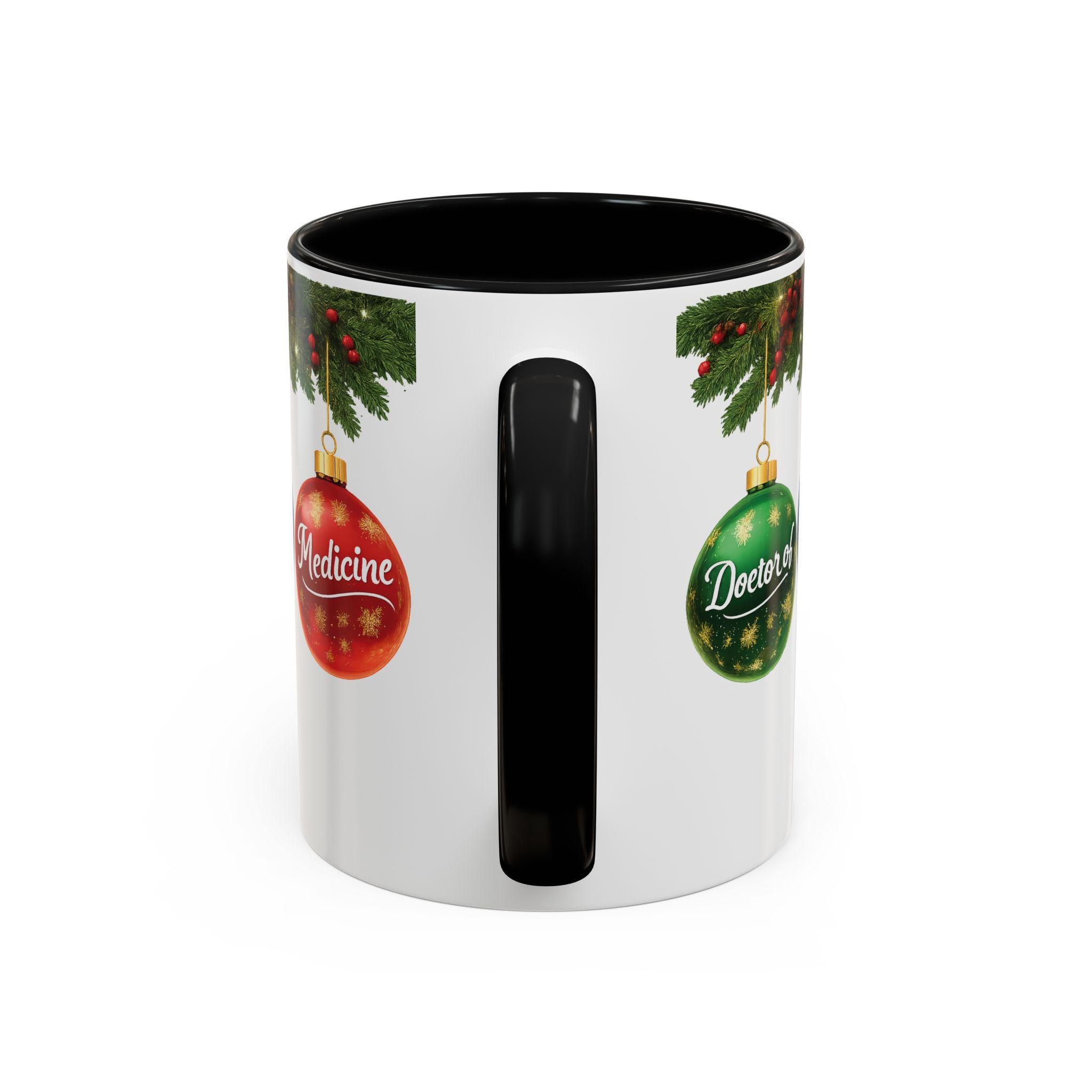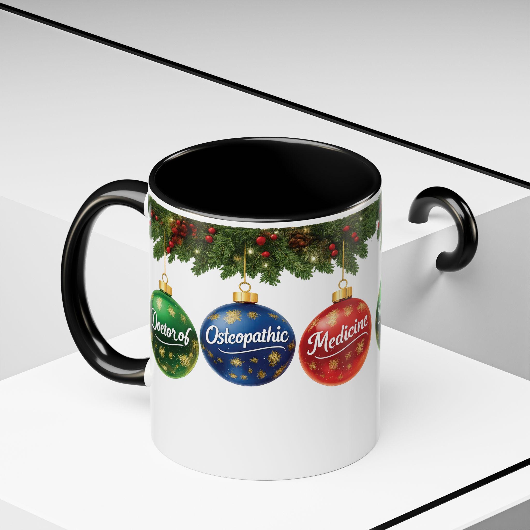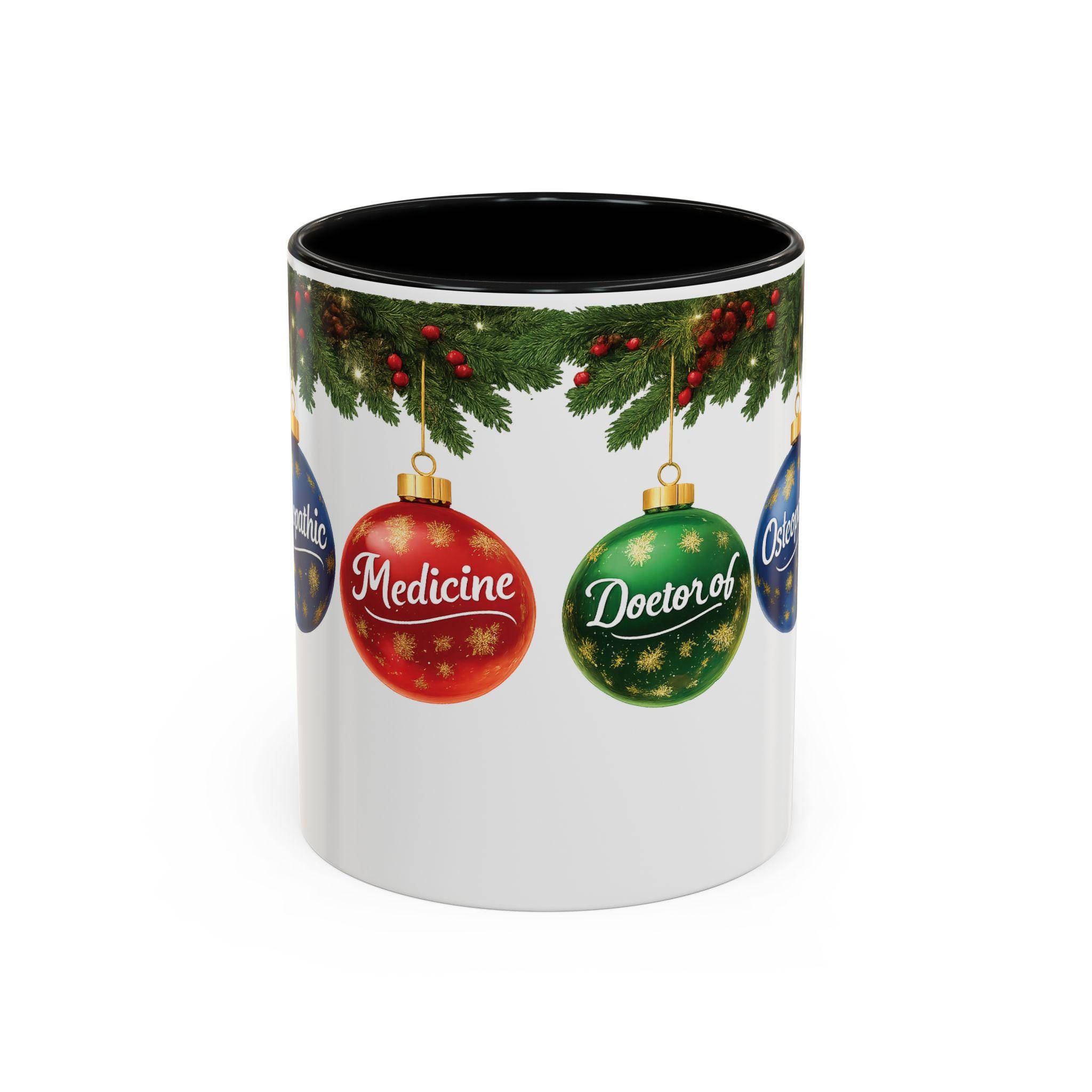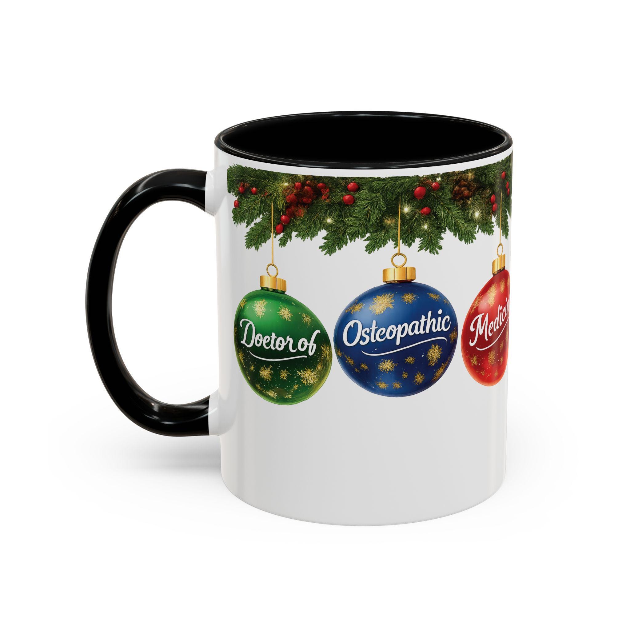 This ceramic accent mug brings warm holiday cheer to a clinician’s desk or kitchen. Glossy white with a contrasting black interior and handle, it features festive evergreen sprigs and three shimmering ornaments labeled “Doctor of,” “Osteopathic,” and “Medicine.” Short, bright bursts of color make the design pop while the curved C-handle feels familiar and comfortable in hand. Sip morning coffee or evening cocoa from a piece that quietly celebrates medical training and the season — a cheerful companion for early rounds, study sessions, or a cozy winter break at home.