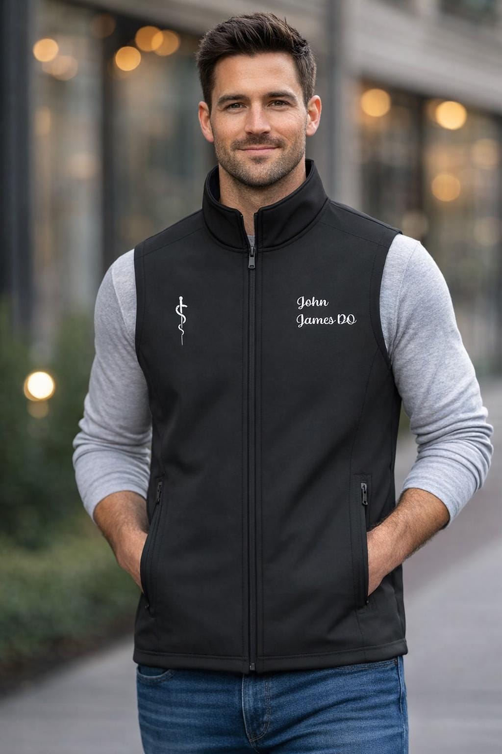 A streamlined soft shell vest built for cool, changeable weather. The lightly insulated microfleece interior gives dry warmth without bulk while the wind-resistant, water-repellent shell sheds light rain and chill. A zip-through cadet collar with chin guard keeps drafts out, and sturdy reverse-coil zippers plus zippered front pockets keep essentials secure. Clean lines and subtle embroidered logo make this vest easy to layer over shirts or under a jacket for commutes, weekend hikes, or outdoor workdays. Add your name or initials opposite the Rod of Asclepius to symbolize osteopathic medicine pride.