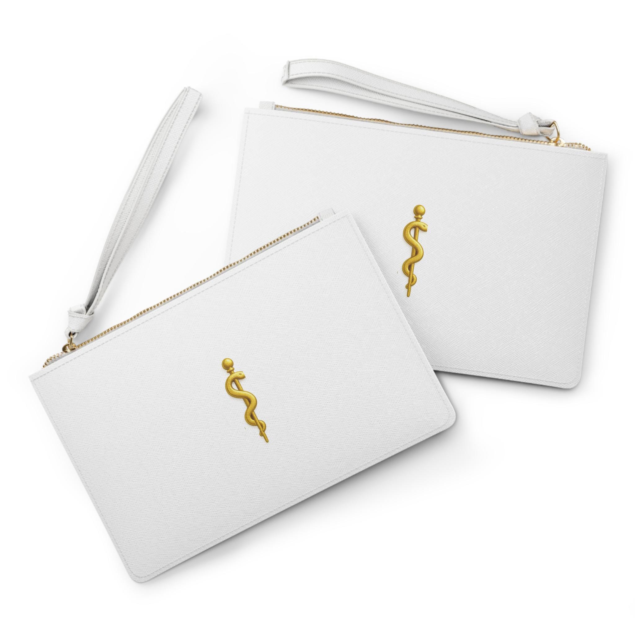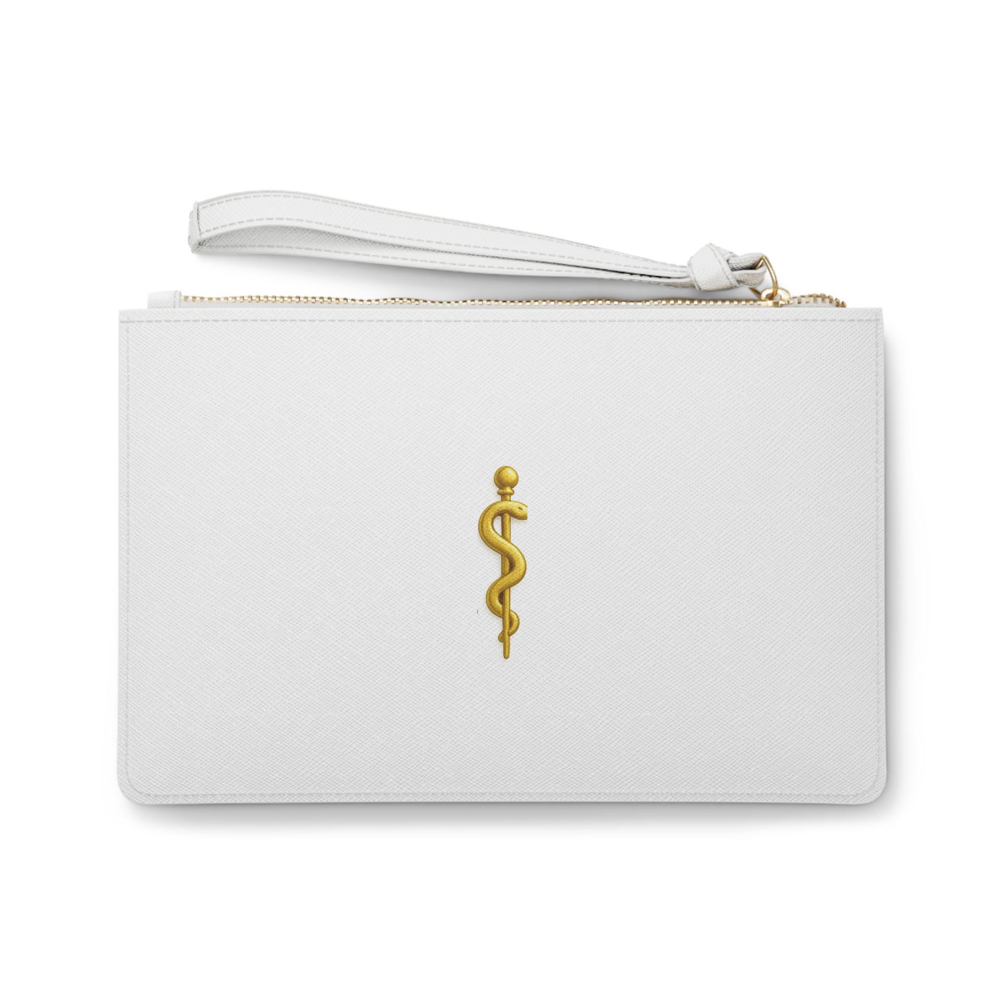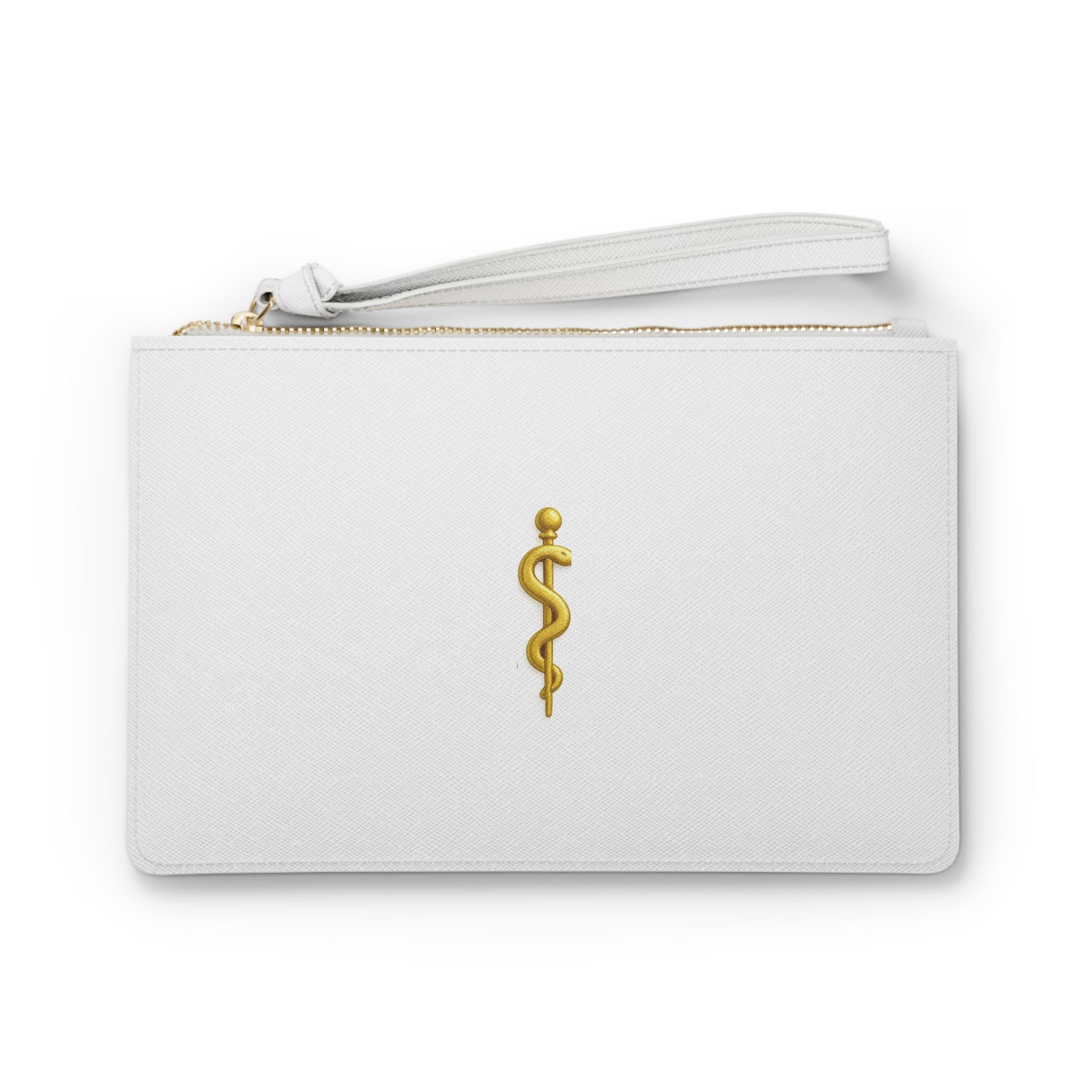 Compact and quietly confident, this gold-accented clutch slips into the rhythm of a night shift or a busy conference. The white zip wristlet carries a subtle Rod of Asclepius emblem — a nod to clinical pride and years spent at the bedside. Smooth saffiano-textured faux leather resists scuffs and reads professional under fluorescent lights. Inside, two compartments and a small pocket keep essentials organized between rounds: pens, ID badge, a small phone, and a few cards. The gold metal zipper and wrist strap make it easy to grab and go when the pager buzzes. It feels polished in hand and familiar in purpose, the kind of small item that holds just what you need for the shift ahead or a quick after-work errand.