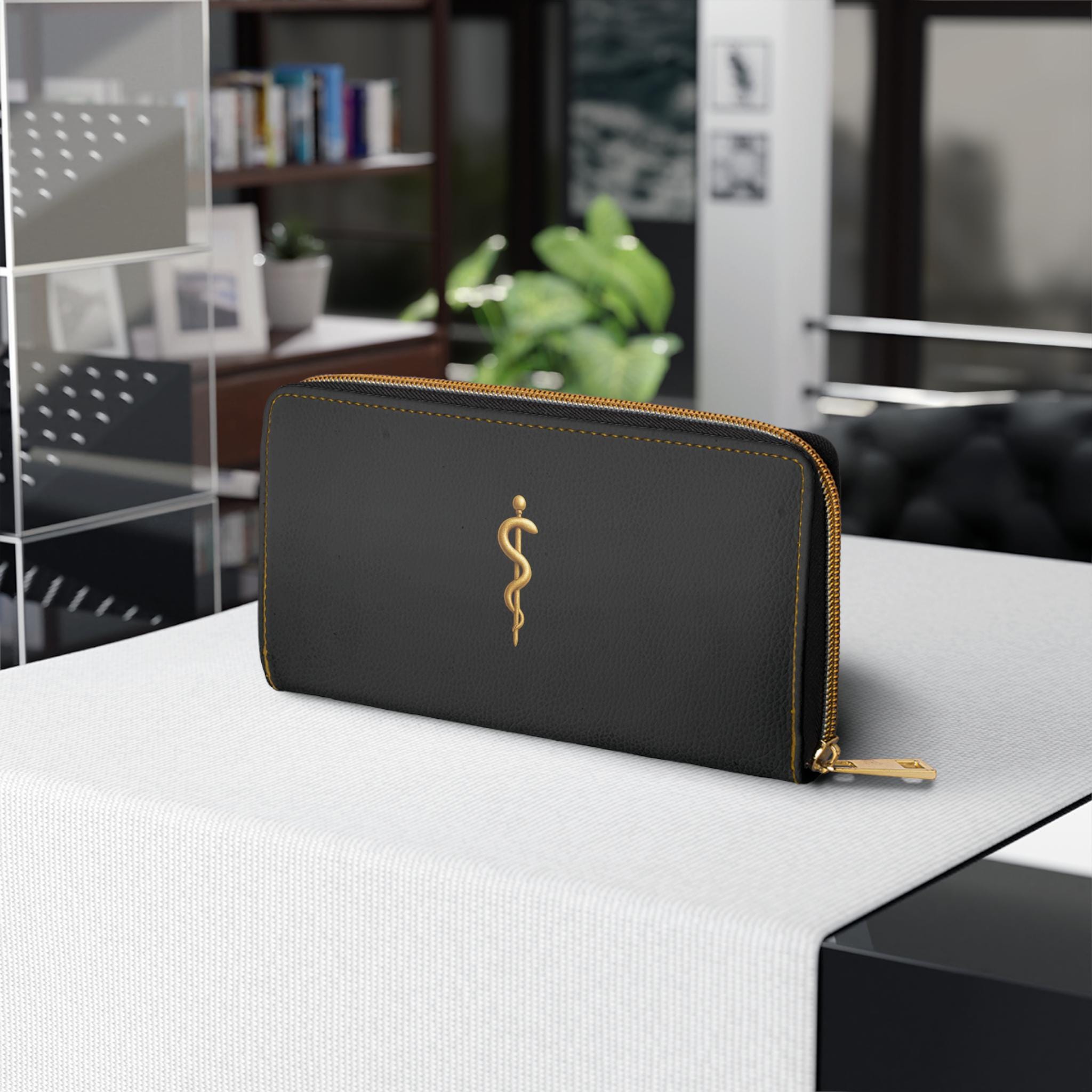 Gold Osteopathic Emblem Zipper Wallet | Black Leather
