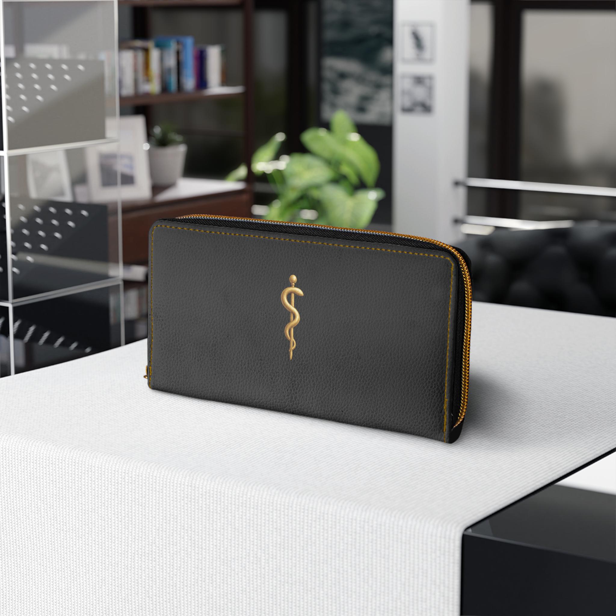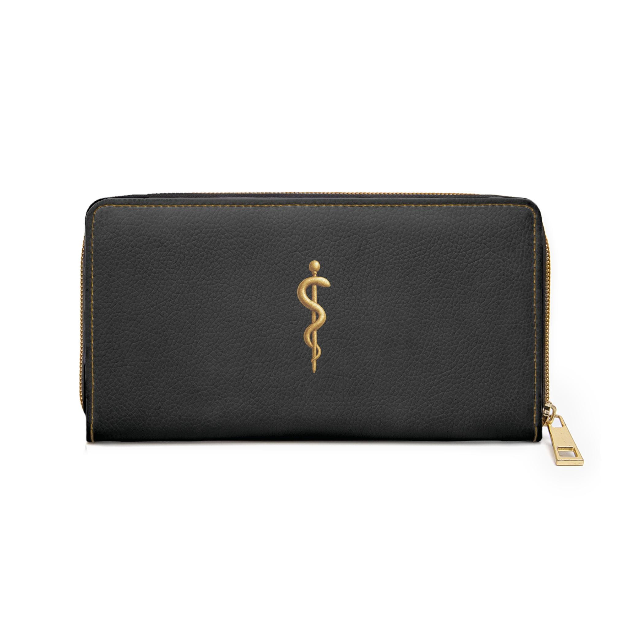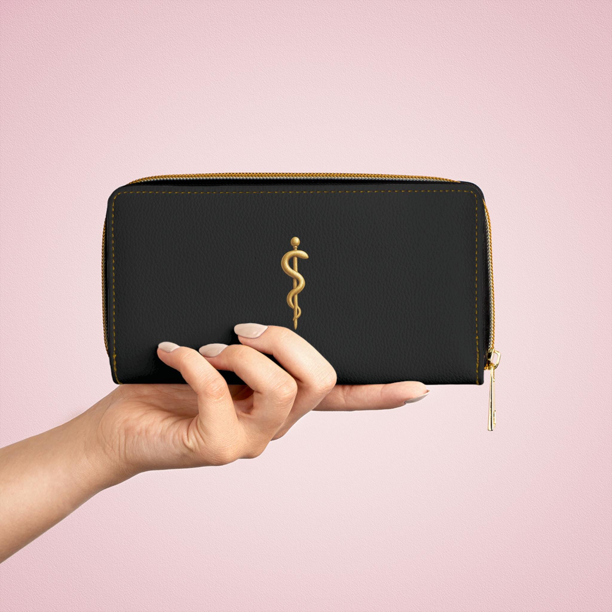 This black leather zipper wallet carries a refined medical-osteopathic presence with a gold DO Asclepius that gives it an upscale air. Clean, polished, and quietly authoritative, it slides into a clinician’s daily rhythm — from morning rounds to after-hours note-taking. The gold emblem pops against the striking red surface, a subtle nod to professional pride without being loud. It lives in lab coats and scrub pockets, but also in briefcases and tote bags, bridging clinical work with everyday errands. Thoughtful pockets keep cash, cards, coins, and a slim checkbook organized. The smooth PU leather and shimmering gold-thread stitching add tactile and visual luxury, while a sturdy nylon zipper and alloy hardware stand up to constant use. For osteopaths, medical students, and healthcare pros who prefer understated, professional accessories, this wallet feels familiar, respected, and made to travel through long shifts and meaningful patient moments.