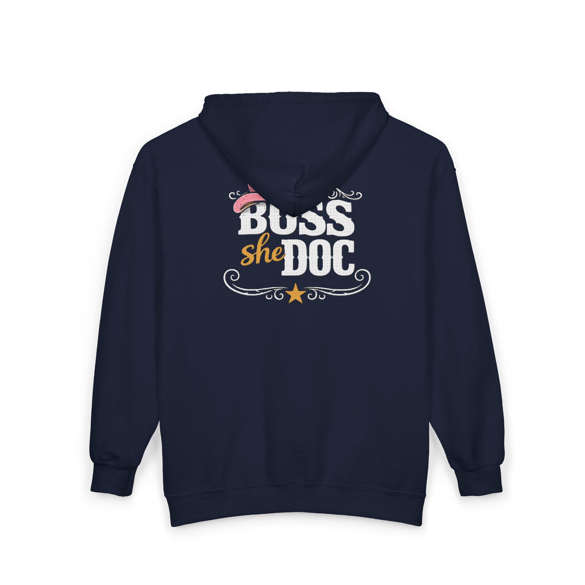 Slide into this embroidered zip hoodie and carry a little Western swagger into your shifts. A soft, mid-weight blend holds the shape of a classic fit while a neat pink cowboy hat and confident female doctor motif sit over the heart — a bit playful, quietly proud. The roomy front pockets and adjustable hood keep hands warm and essentials close during late rounds or long drives home. Tubular knit construction gives the body a clean, seamless look so the design reads crisp and elevated. Wear it between rounds, at clinic meet-ups, or out to a country night; it reads professional and personal at once, like someone who heals by day and rides by dusk.