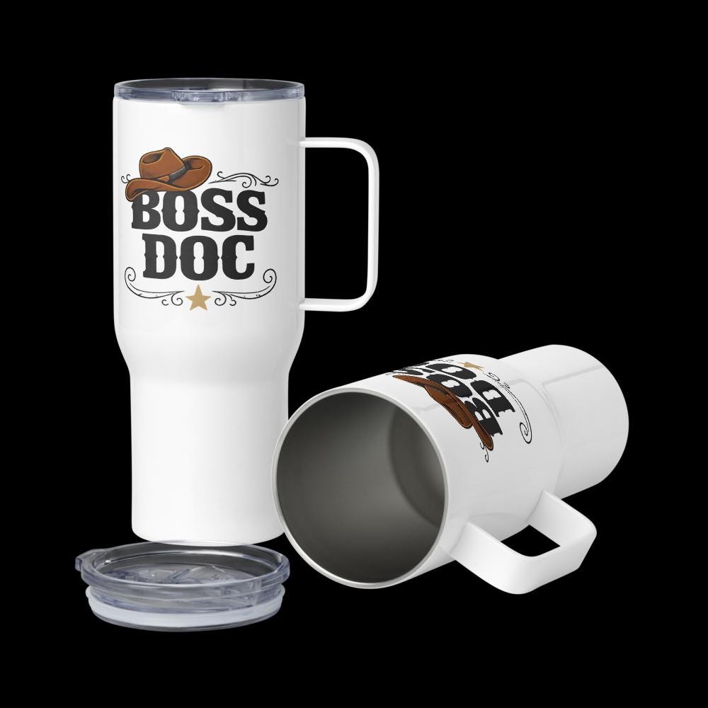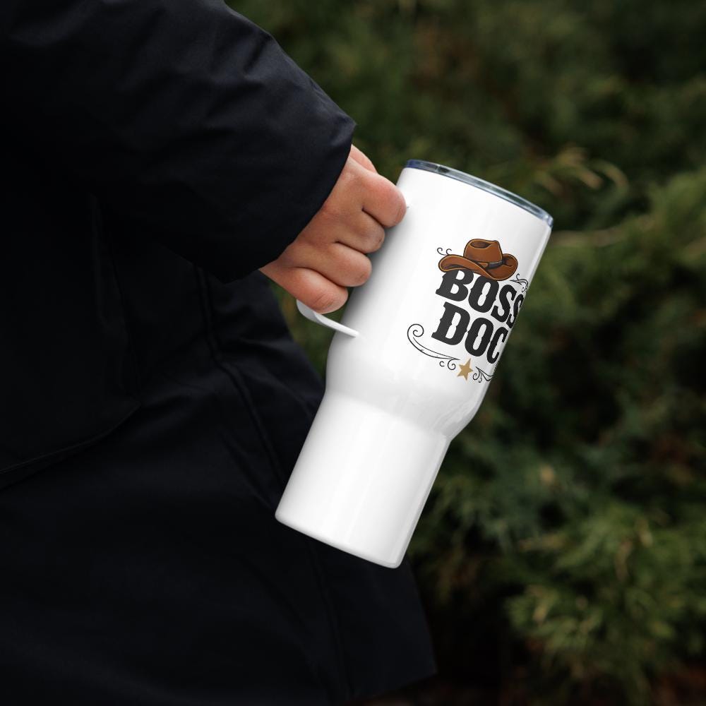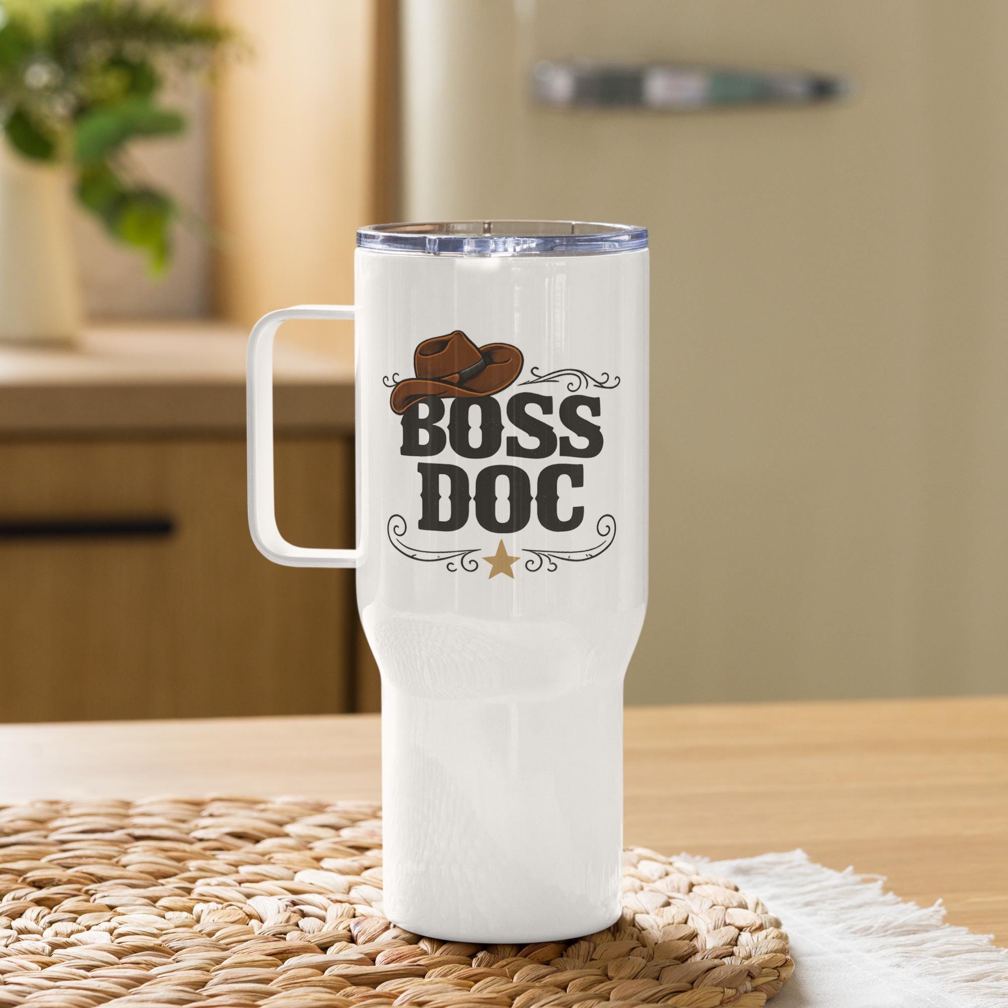 Sip in style and comfort with this professional pride travel mug. Boss Doc western lettering with a cowboy hat on the side shows your cowboy flair. With its sleek and durable design, you’ll love taking this mug wherever you go. It fits into most car cup holders and has a spill-proof plastic lid. Commute to work or go on new adventures—this travel mug will keep your beverage safe and at just the right temperature.