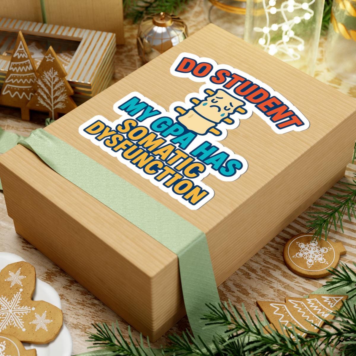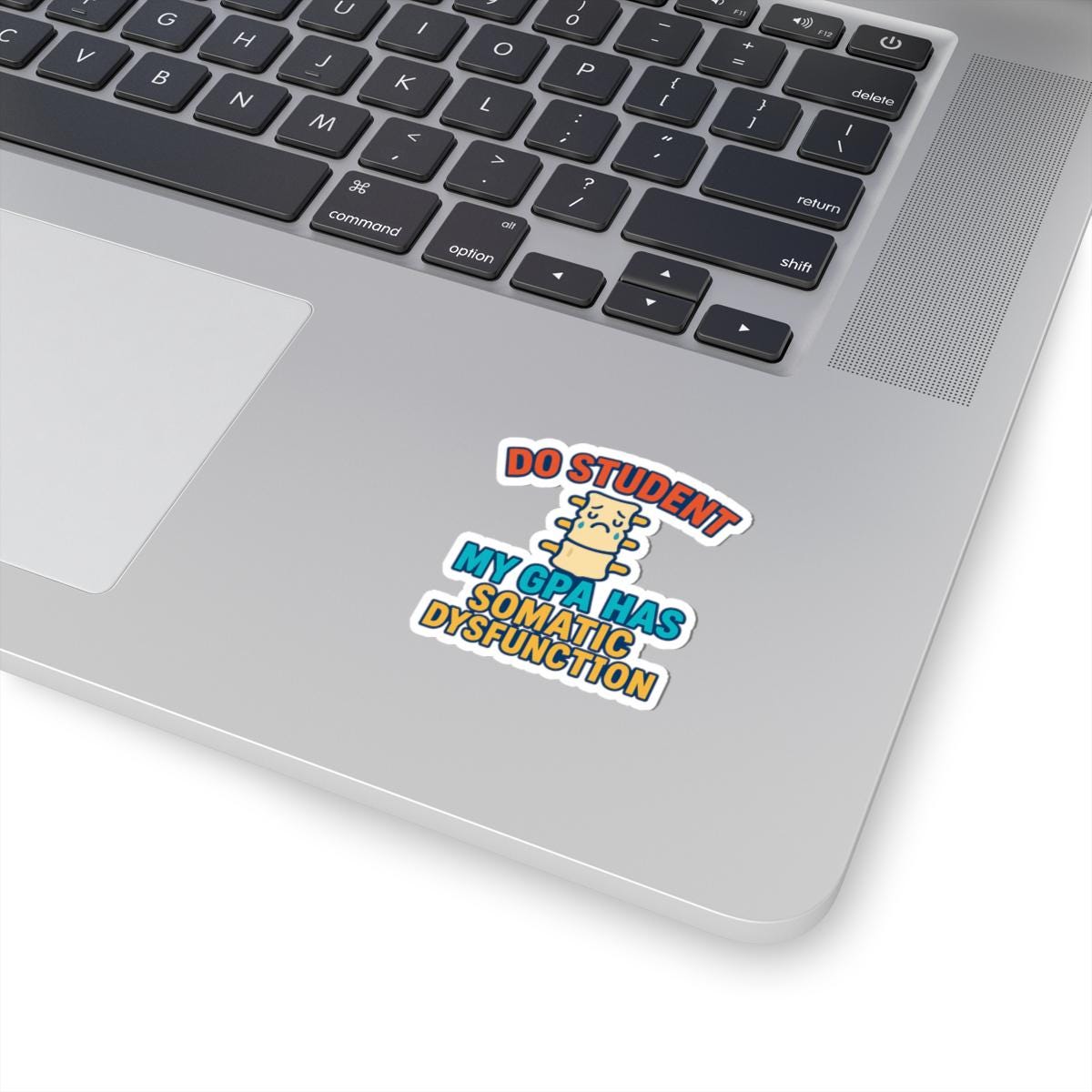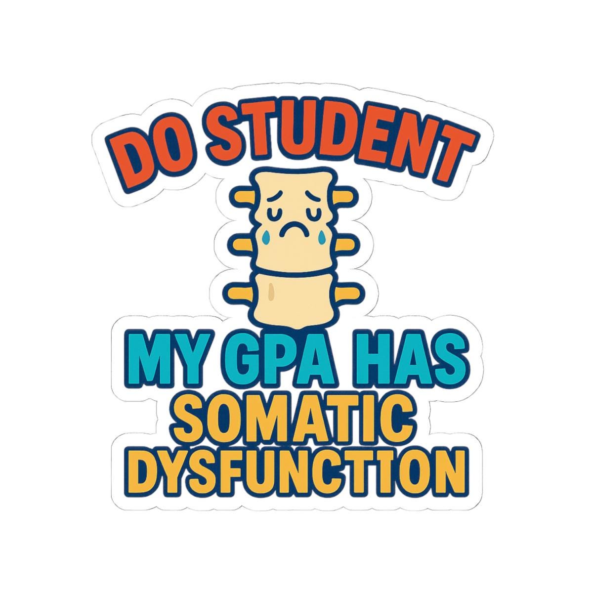 A witty, slightly nerdy sticker that speaks straight to stressed-out students and spine-savvy med school folk. The compact, glossy decal shows a distressed cartoon vertebra and the blunt line “DO STUDENT MY GPA HAS SOMATIC DYSFUNCTION,” a funny nod to anatomy class, clinic nights, and all-nighters. Place it on a laptop, journal, water bottle, or clinic kit to add a bit of dark humor and personality to study sessions and shift handoffs. It’s bold, simple, and readable from a short distance — the kind of laugh that starts conversations in lecture halls and study groups.