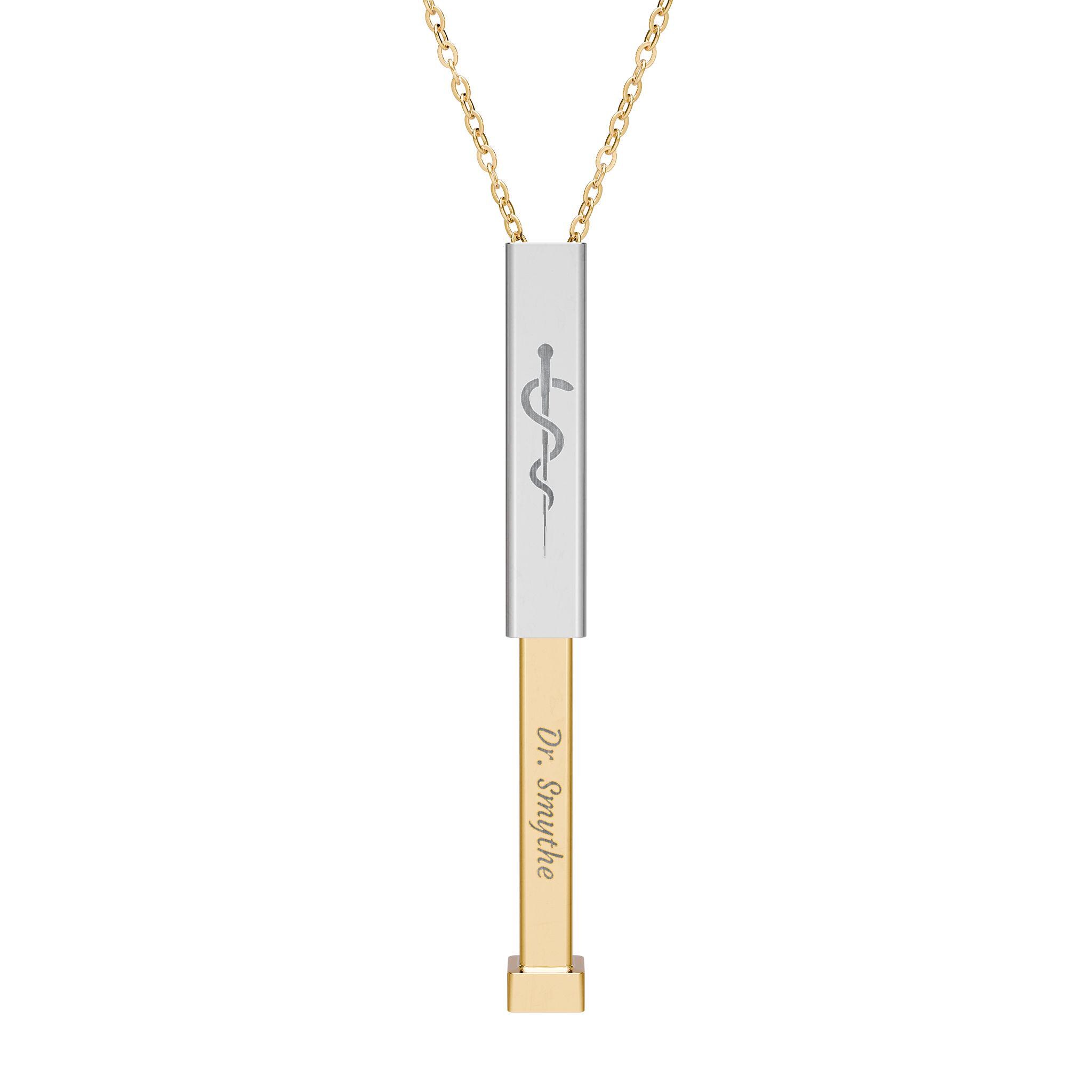 A delicate sliding bar necklace that keeps a personal message close to the chest while celebrating a medical calling. The slim bar can be engraved with your name and credentials or initials, and the front features the Osteopathic Rod of Asclepius—subtle, professional, and meaningful. The 316L surgical-grade stainless steel base is PVD-coated in 18K gold for a polished, hypoallergenic finish that resists water and tarnish. The adjustable 16" + 2" chain lets the wearer layer it or wear it solo, and it arrives in a white jewelry box with non-tarnish cotton fiber for safe keeping. This piece feels quiet and confident: a wearable reminder of care, dedication, and the nights spent learning the art of healing.