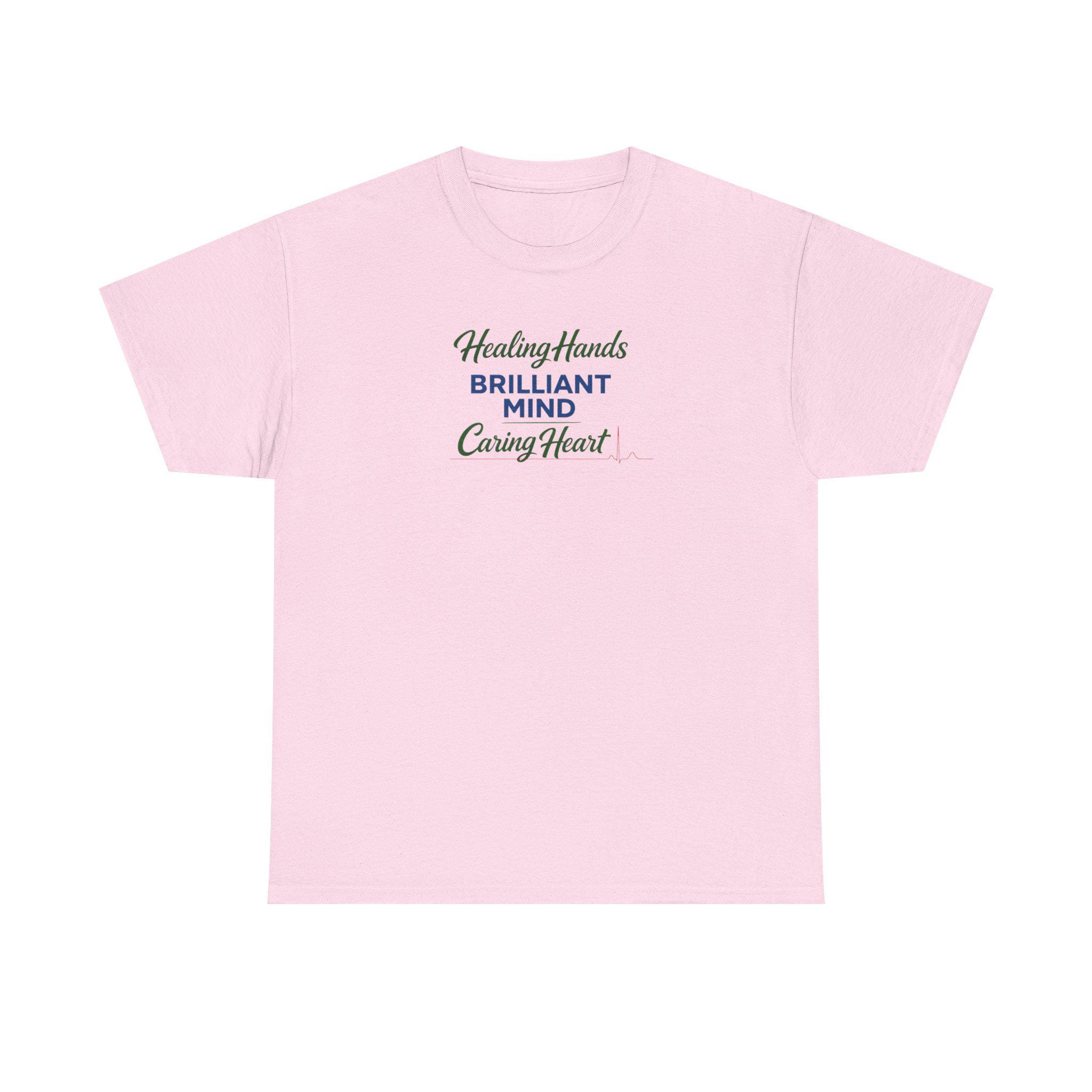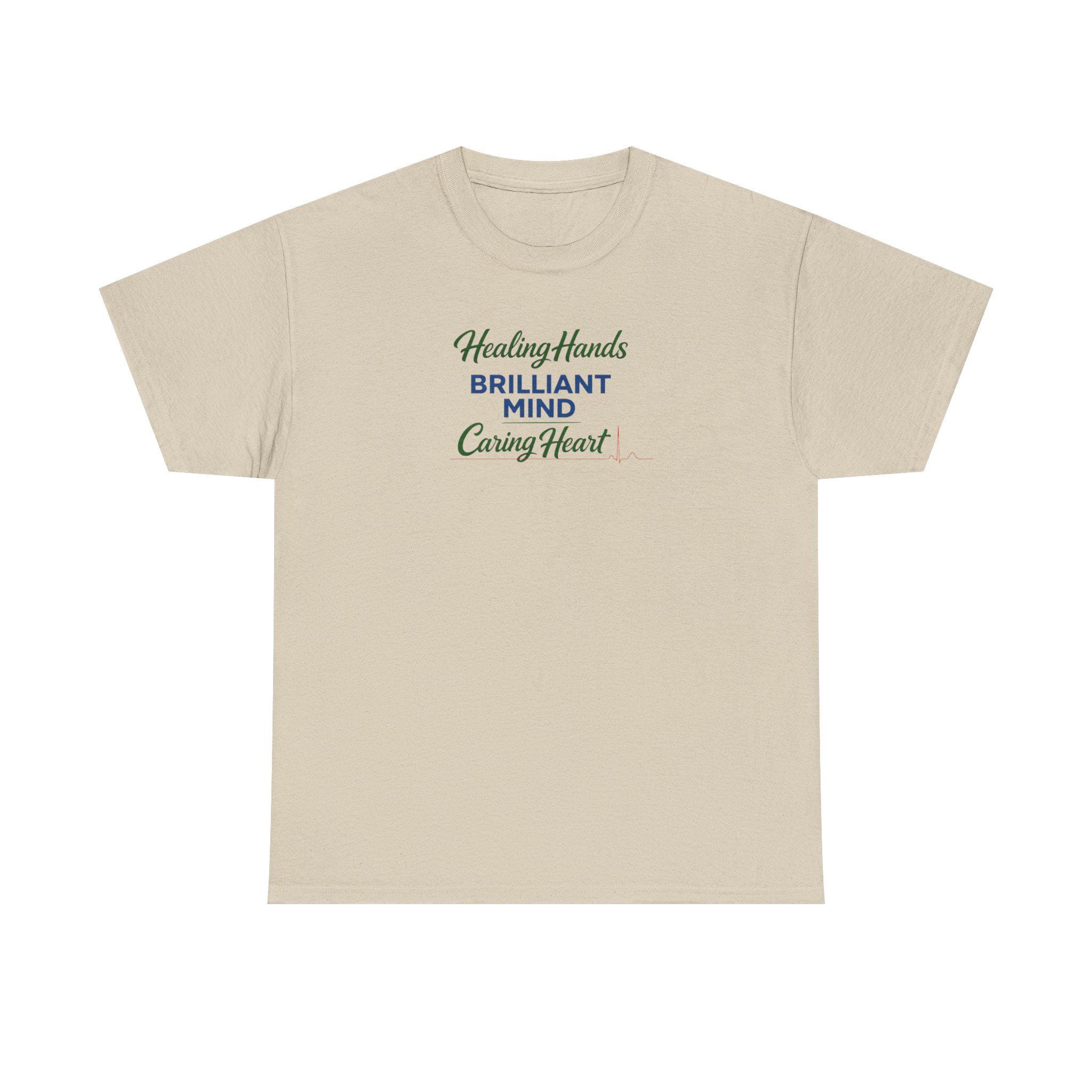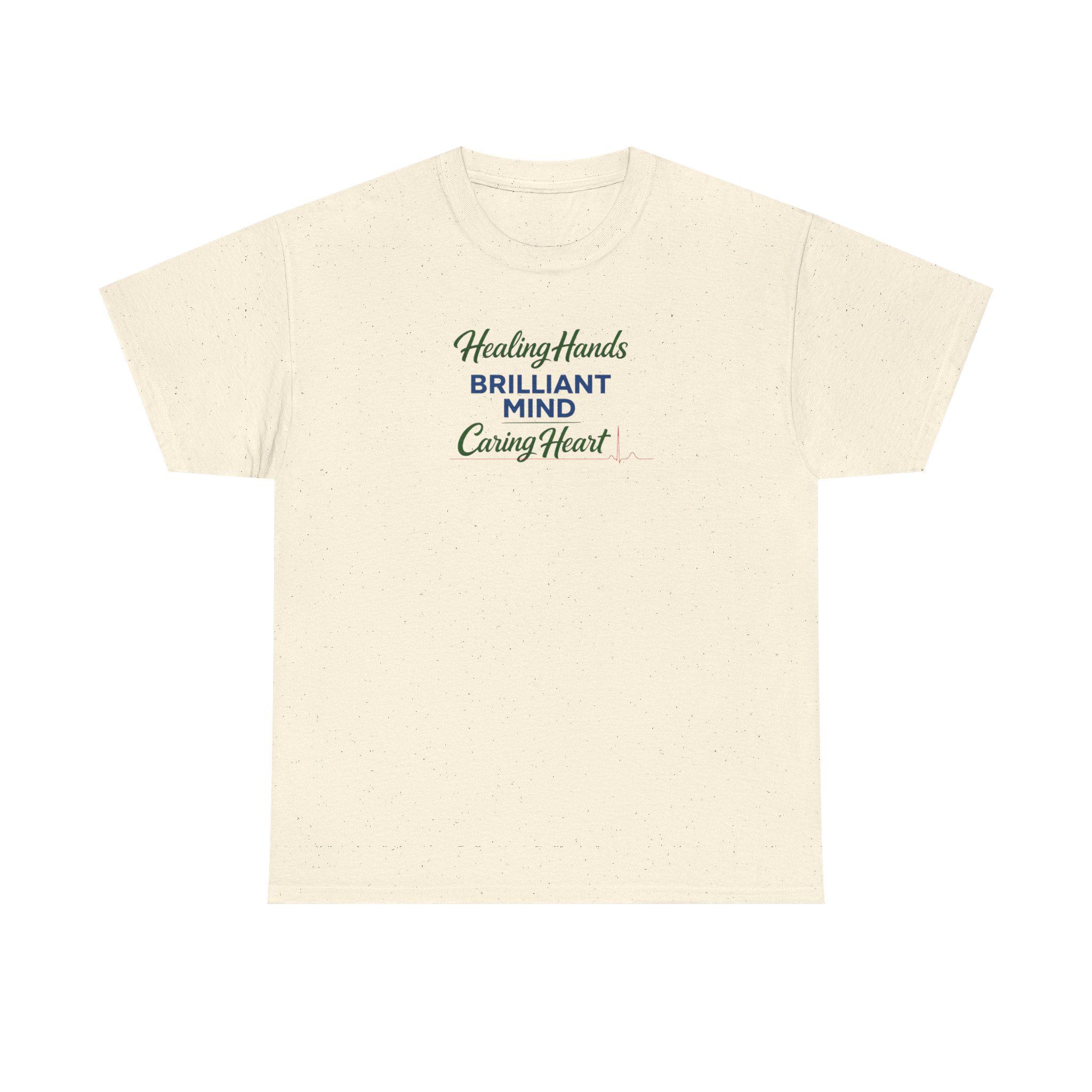 This medical-themed tee carries quiet pride: a set of healing hands, a brilliant mind, and a caring heart woven into an EKG-style emblem across the chest. It feels like the soft exhale after a long shift — familiar, steady, and honest. Wear it to rounds, study sessions, or the coffee-station debrief; it reads like a nod to those who keep others steady. The design sits clean and clear on the fabric, letting coworkers, classmates, and patients recognize the compassion and competence behind the badge without shouting. Subtle enough for everyday wear, it also holds its ground at graduation nights, clinical celebrations, and low-key reunions with the team. This shirt honors the rhythm of care and the steady pulse of people who show up.